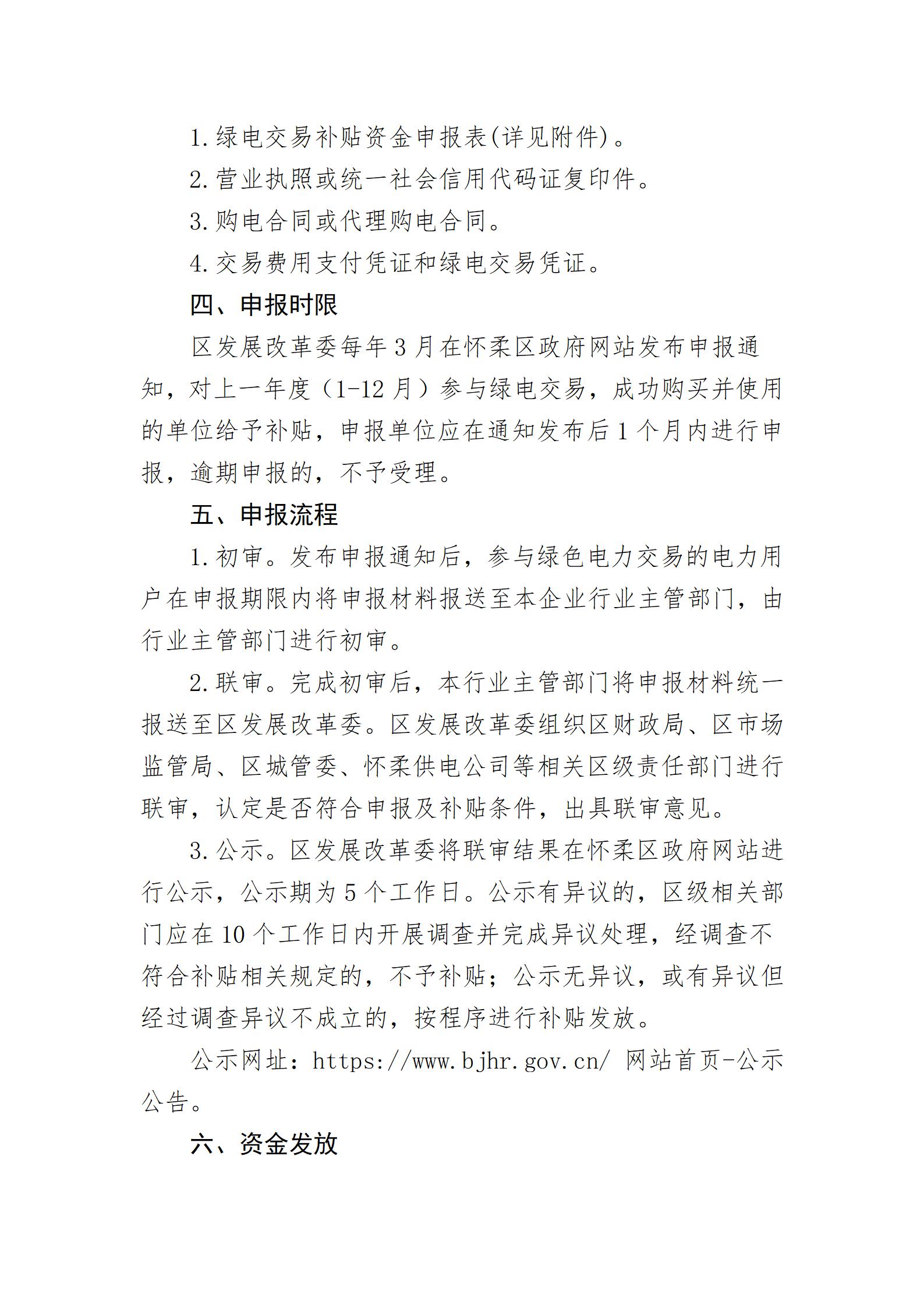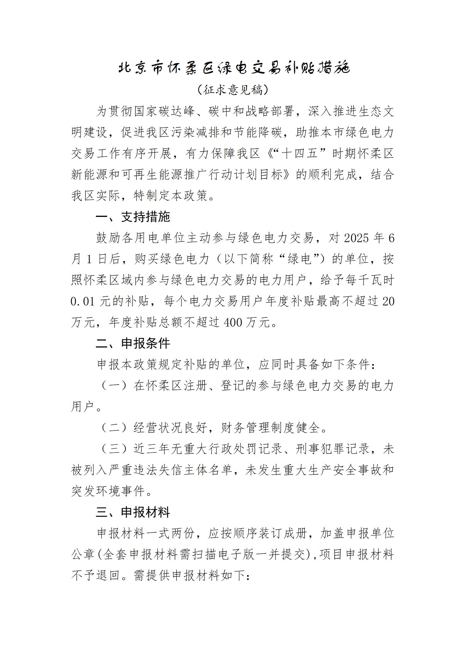 4月8日,北京懷柔發(fā)改委發(fā)布關(guān)于對(duì)《北京市懷柔區(qū)綠電交易補(bǔ)貼措施(征求意見(jiàn)稿)》公開(kāi)征集意見(jiàn)的公告。 根據(jù)公告,鼓勵(lì)各用電單位主動(dòng)參與綠色電力交易,對(duì)2025年6月1日后,購(gòu)買(mǎi)綠色電力(以下簡(jiǎn)稱“綠電”)的單位,按照懷柔區(qū)域內(nèi)參與綠色電力交易的電力用戶,給予每千瓦時(shí)0.01元的補(bǔ)貼,每個(gè)電力交易用戶年度補(bǔ)貼最高不超過(guò)20萬(wàn)元,年度補(bǔ)貼總額不超過(guò)400萬(wàn)元。 申報(bào)條件 申報(bào)本政策規(guī)定補(bǔ)貼的單位,應(yīng)同時(shí)具備如下條件: (一)在懷柔區(qū)注冊(cè)、登記的參與綠色電力交易的電力用戶。 (二)經(jīng)營(yíng)狀況良好,財(cái)務(wù)管理制度健全。 (三)近三年無(wú)重大行政處罰記錄、刑事犯罪記錄,未被列入嚴(yán)重違法失信主體名單,未發(fā)生重大生產(chǎn)安全事故和突發(fā)環(huán)境事件