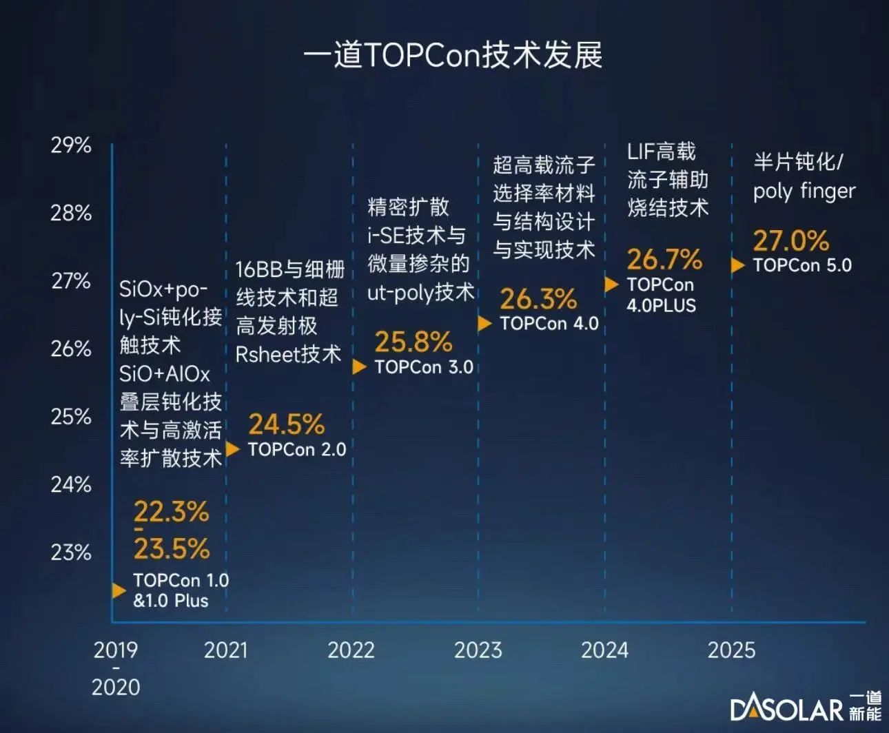 宋登元博士發(fā)言 TOPCon5.0顛覆性創(chuàng)新是什么? 一道新能從成立之日起,對光伏技術路線進行深入解析,憑借創(chuàng)始團隊深厚的技術積累,毫不猶豫的選擇了TOPCon技術路線進行攻關。同時基于先進的SiO?/Poly-Si鈍化接觸技術,創(chuàng)立了“一主三翼”全技術體系發(fā)展戰(zhàn)略,踐行“量產(chǎn)一代、研發(fā)一代、儲備一代”發(fā)展理念。從TOPCon1.0到最近推出的TOPCon 5.0技術,在效率和可靠性上實現(xiàn)了重大突破。 TOPCon5.0的突破性技術包括背面PolyFinger技術:通過激光精密圖形化,在電池背面形成微米級“光陷阱”,將紅外光吸收效率提升0.3%-0.5%;納米接觸金屬化技術:以納秒激光誘導形成納米級接觸點,接觸電阻降低至0.5mΩ·cm2以下;大高寬比梯形柵線技術:通過新型漿料與鋼板印刷技術提升對入射光子利用率,優(yōu)化電流傳輸,提升填充因子至85%以上;混合鈍化邊緣技術:通過獨有的有機/無機混合鈍化,在電池切割面形成鈍化和耐候性良好均的鈍化層,降低邊緣復合損失,提升半片電池效率;疊層膜耦合鈍化技術:采用原子層沉積(ALD)工藝,將氫-硅鍵的抗紫外能力提升一個量級,UVID120老化測試下衰減率低于0.8%。TOPCon5.0電池轉換效率已推升至27%,組件功率突破670W大關,顯著提升產(chǎn)品的綜合發(fā)電效率。作為N型技術路線的引領者,一道新能通過光電轉換效率與經(jīng)濟性的雙重突破,重新定義N型TOPCon光伏產(chǎn)品的價值維度,引領行業(yè)開啟嶄新發(fā)展時代。