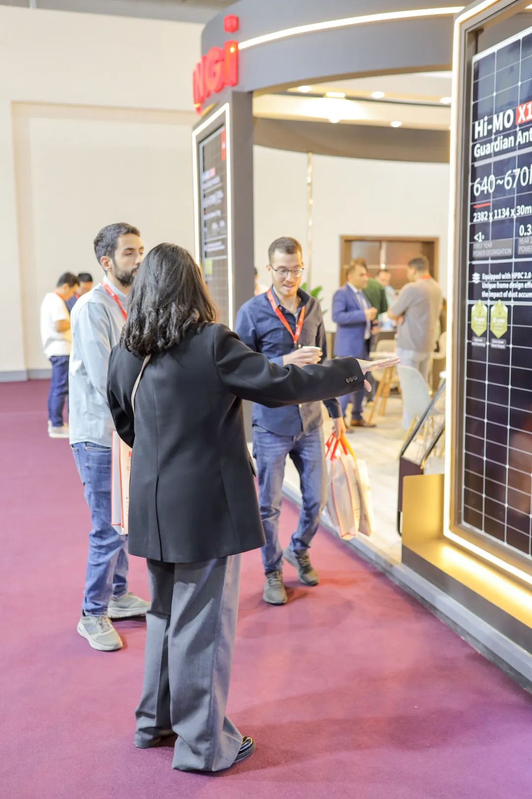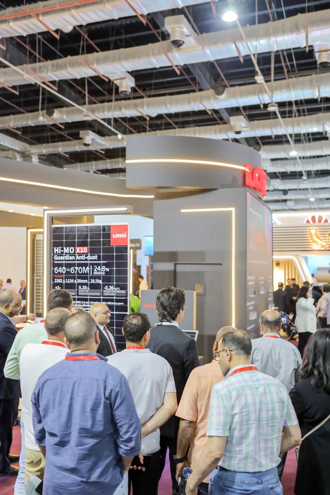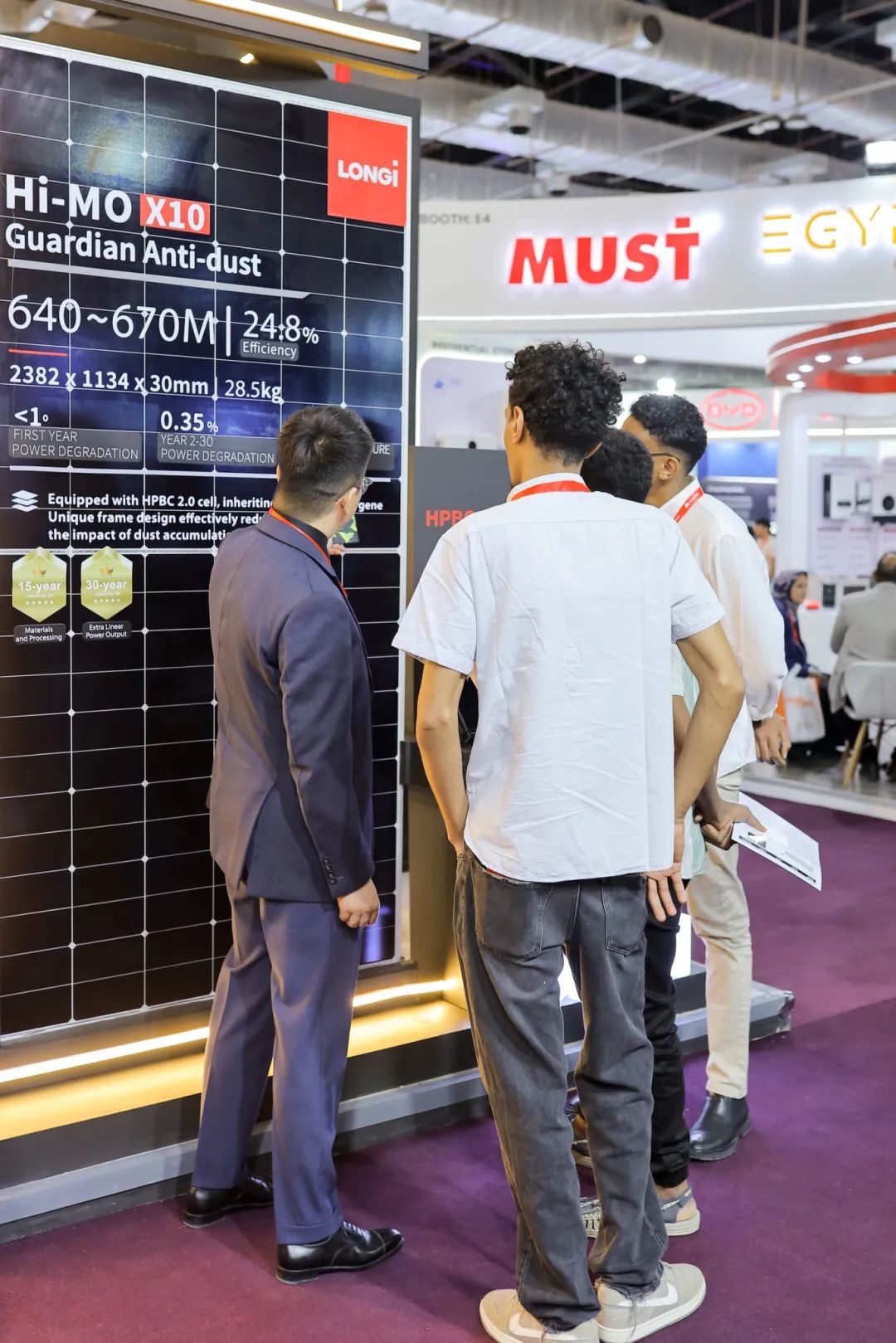 01、量身定制,Hi-MO X10 埃及登場(chǎng) 本次展會(huì),隆基Hi-MO X10單雙面組件整齊亮相,吸引大批參展者、與會(huì)客戶的濃厚興趣,迅速成為全場(chǎng)焦點(diǎn)。