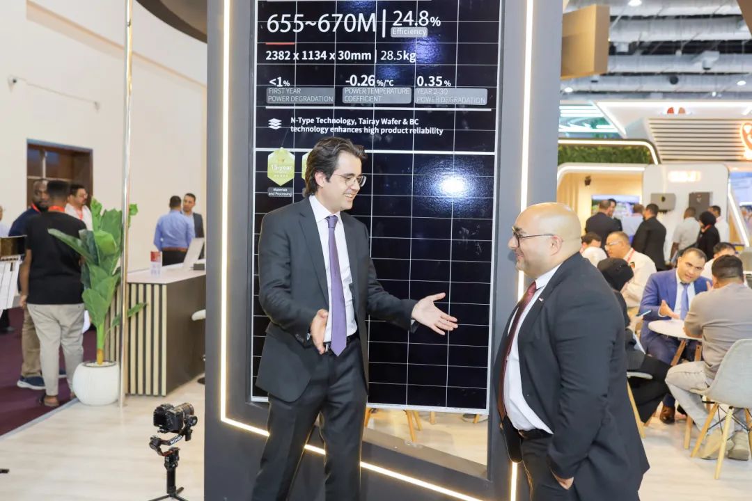 隆基旗艦產(chǎn)品Hi-MO X10系列組件,憑借24.8%的組件效率、670W超高功率、全生命周期發(fā)電量?jī)?yōu)勢(shì),以及中東北非工作場(chǎng)景的高可靠性,成功吸引了參會(huì)專家、展商和客戶的目光。 中東北非地區(qū)氣候炎熱,高溫是光伏組件面臨的常態(tài)挑戰(zhàn)。Hi-MO X10組件憑借行業(yè)領(lǐng)先的溫度系數(shù)-0.26%/°C,相比傳統(tǒng)組件,高溫發(fā)電效率顯著提升。在85°C的極端高溫環(huán)境下,Hi-MO X10的發(fā)電量比傳統(tǒng)組件高出2.18%,有效減少了高溫對(duì)發(fā)電效率的負(fù)面影響,確保在炎熱夏季也能穩(wěn)定輸出電力,為客戶帶來(lái)更高的發(fā)電收益。 沙塵是中東北非地區(qū)光伏組件運(yùn)行的另一大挑戰(zhàn)。Hi-MO X10組件采用創(chuàng)新的防積灰設(shè)計(jì),能夠有效減少灰塵對(duì)組件表面的覆蓋,降低因積灰導(dǎo)致的發(fā)電效率下降。Hi-MO X10獨(dú)特的類旁路二極管結(jié)構(gòu),即使在部分遮擋的情況下,也能確保組件整體的發(fā)電效率,減少因沙塵遮擋造成的發(fā)電損失,保障組件在惡劣環(huán)境下的高效運(yùn)行。 展會(huì)現(xiàn)場(chǎng),隆基還邀請(qǐng)來(lái)訪客戶及參展者現(xiàn)場(chǎng)參與互動(dòng),現(xiàn)場(chǎng)操作Hi-MO X10組件對(duì)比傳統(tǒng)TOPCon組件的弱光發(fā)電對(duì)比實(shí)驗(yàn),即便在展廳室內(nèi)的弱光環(huán)境下,Hi-MO X10始終展現(xiàn)出絕佳的弱光條件下的發(fā)電優(yōu)勢(shì),獲得了到訪客戶的一致稱贊與認(rèn)可。