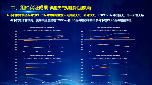 不同技術類型組件較PERC組件發(fā)電增益在不同典型天氣下差異較大,TOPCon組件在陰天、雨天和雪天條件下發(fā)電增益較高,受環(huán)境溫度影響TOPCon和IBC組件在冬季晴天條件下較PERC組件增益降低。