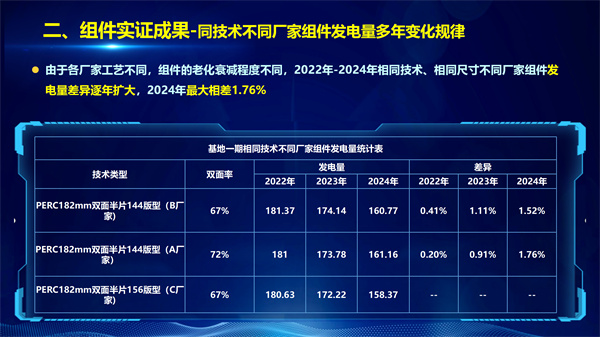 2024年發(fā)電量與往年同期相比趨勢基本一致,均為TOPCon技術類型組件發(fā)電量最高,其中2022年-2024年TOPCon平均值發(fā)電量較PERC、IBC組件分別高2.02%,1.43%。