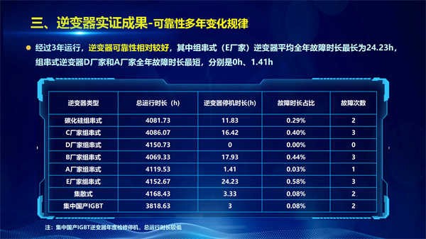 經過三年運行,不同類型逆變器實測中國效率均有所下降,第一年降幅0.04%,第二年降幅為0.34%,但仍保持97.5%以上;經過三年運行,國產IGBT逆變效率降低0.27%,進口IGBT逆變器效率降低0.18%。
