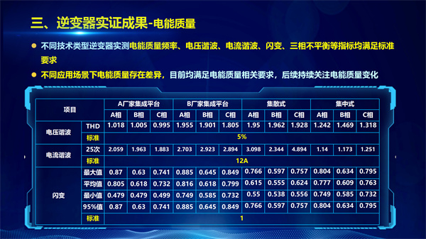 電能質量方面,不同技術類型逆變器實測電能質量頻率、電壓諧波、電流諧波、閃變、三相不平衡等指標均滿足標準要求。但不同應用場景下電能質量存在差異,目前均滿足電能質量相關要求,后續(xù)持續(xù)關注電能質量變化。