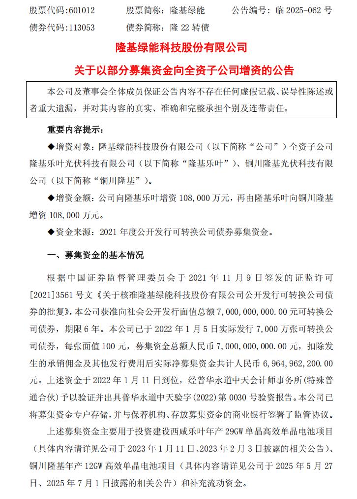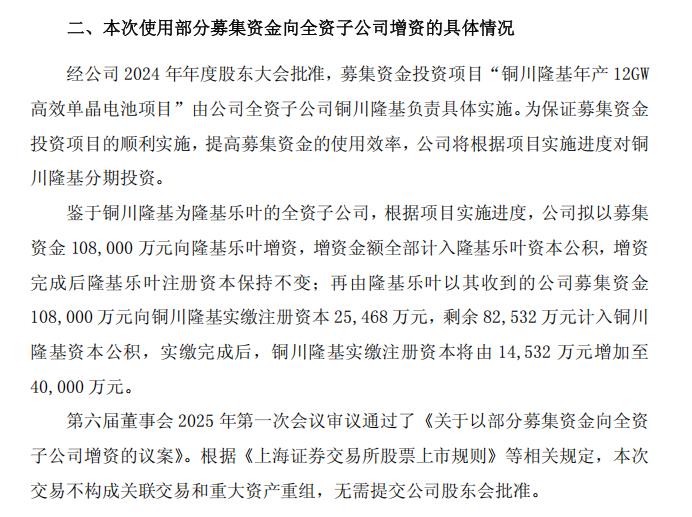 6月30日晚,隆基綠能發(fā)布《關于以部分募集資金向全資子公司增資的公告》,擬通過隆基樂葉向銅川隆基增資10.8億元,該項資金將用于“銅川隆基年產12GW高效單晶電池項目”建設。 隆基綠能表示,本次對全資子公司銅川隆基增資是基于公司實施相關募投項目的建設需要,符合公司股東會批準的募投項目實施內容。募集資金的使用方式、用途等符合公司主營業(yè)務發(fā)展方向,有利于提升公司盈利能力,符合公司及全體股東的利益。
