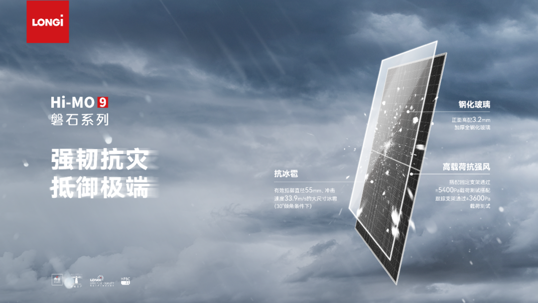 ? 硬核抗雹:經(jīng)得起極端氣候考驗(yàn)的 “鋼筋鐵骨” 隆基Hi-MO 9磐石系列組件采用全面加厚的雙玻結(jié)構(gòu),正面玻璃相比常規(guī)產(chǎn)品厚度提高60%,采用全鋼化工藝,玻璃強(qiáng)度(抗沖擊)較常規(guī)玻璃提升4.5倍。邊框采用6005-T6高強(qiáng)度鋁合金邊框,邊框線密度優(yōu)化提升,使組件抗風(fēng)載荷能力進(jìn)一步增強(qiáng),Hi-MO 9磐石組件搭配高載荷安裝方案,最高可承受+5400/-5400Pa載荷。此外,該組件已經(jīng)過多次加嚴(yán)測試,可成功抵御直徑55mm,速度33.9m/s的冰雹沖擊,遠(yuǎn)超IEC標(biāo)準(zhǔn)的25mm冰雹的測試要求,測試后組件外觀無裂紋、EL檢測無隱裂,遠(yuǎn)超17級臺風(fēng)沖擊的極端條件。 ? 高效發(fā)電:極端環(huán)境沖擊下的穩(wěn)定輸出 擁有“鋼筋鐵骨”之軀的Hi-MO 9磐石組件,搭載了隆基自主研發(fā)的HPBC 2.0電池技術(shù),轉(zhuǎn)換效率高達(dá)24.8%,綜合發(fā)電能力表現(xiàn)卓越。高載荷專用材料升級也為其在極端環(huán)境下的高效可靠表現(xiàn)奠定了堅(jiān)實(shí)基礎(chǔ)。 對比100MW的TOPCon組件電站,同等土地面積下,Hi-MO 9系列組件裝機(jī)容量可到105MW,即使在光照資源中等地區(qū),按照電價(jià)0.35元/kWh計(jì)算,全生命周期發(fā)電收益增加4000萬元以上。同時(shí)得益于BC技術(shù)獨(dú)有的抗熱斑特性,疊加“隆基產(chǎn)品生命周期標(biāo)準(zhǔn)”質(zhì)量管控,有效確保了Hi-MO 9組件在電站端的更高可靠性及更低失效率表現(xiàn),成為全球客戶更安心的價(jià)值之選。