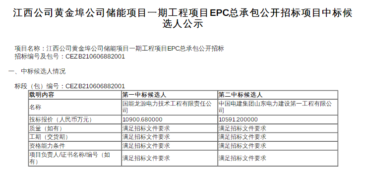 11月15日國能黃金埠發(fā)電有限公司發(fā)布江西黃金埠公司儲能項(xiàng)目EPC總承包中標(biāo)候選人公示,第一候選人為報(bào)價(jià)10900.68萬的國能龍?jiān)措娏夹g(shù)工程有限責(zé)任公司,第二候選人為報(bào)價(jià)10591.2萬的中國電建集團(tuán)山東電力建設(shè)第一工程有限公司。