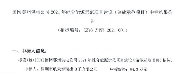 近日國網(wǎng)湖北綜合能源發(fā)布2021年綜合能源示范項目建設(shè)(儲能示范項目)中標結(jié)果公示。深圳市航天泰瑞捷電子有限公司成功中標。