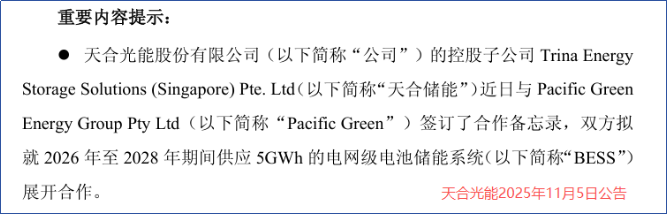 而且,天合富家董事長(zhǎng)高海純,是天合光能董事長(zhǎng)之女,曾被譽(yù)為“最美光二代”。 父女聯(lián)手,本想合力闖出一片天,但光伏寒冬于2024年呼嘯而來。當(dāng)年年底,天合光能宣布終止天合富家上市事宜。 IPO折戟,公司并未灰心,仍在尋找下一個(gè)突破點(diǎn)。 海外市場(chǎng)吞下GW級(jí)儲(chǔ)能大單 儲(chǔ)能,成了新方向! 從裝機(jī)增速與規(guī)模而言,儲(chǔ)能正復(fù)刻此前光伏行業(yè)的成長(zhǎng)路徑。2025年9月12日,新能儲(chǔ)能規(guī)?;ㄔO(shè)方案頒布,計(jì)劃2027年全國儲(chǔ)能裝機(jī)規(guī)模達(dá)到1.8億千瓦以上。 2025上半年,國內(nèi)儲(chǔ)能裝機(jī)規(guī)模達(dá)到0.95億千瓦,以1.8億千瓦目標(biāo)值來算,預(yù)計(jì)未來2-3年內(nèi)將實(shí)現(xiàn)翻倍增長(zhǎng),步入新的高速發(fā)展階段。 國內(nèi)五大光伏巨頭中,天合光能是唯一實(shí)現(xiàn)儲(chǔ)能業(yè)務(wù)放量的公司。2024年,公司儲(chǔ)能業(yè)務(wù)實(shí)現(xiàn)收入23.35億。 更震撼的是,近日公司接連拿下海外儲(chǔ)能大單,勢(shì)頭銳不可擋。 2025下半年來,公司于10月份與歐洲客戶,簽訂超1GWh的儲(chǔ)能產(chǎn)品合同;又于11月5日發(fā)布公告,宣布與Pacific Green客戶簽訂合作備忘錄,2026-2028年間,向其供應(yīng)5GWh的儲(chǔ)能系統(tǒng)訂單。