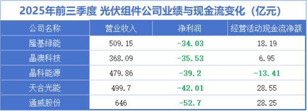 光伏競(jìng)爭(zhēng),進(jìn)入深水區(qū)。 2023年,國內(nèi)新增光伏裝機(jī)216.9GW,同比大增148%;2024年新增裝機(jī)277.1GW,同比增速降至28%。裝機(jī)熱潮降溫后,光伏行業(yè)能否于平靜之處,煥發(fā)新生機(jī)? 數(shù)據(jù),已經(jīng)給出答案! 三季報(bào)披露季落幕,光伏巨頭相繼交上成績(jī)單。 從財(cái)報(bào)上看,2025年前三季度,全球組件出貨量前五大公司仍陷虧損泥沼。通威股份(26.960, 2.00, 8.01%)當(dāng)期凈利潤虧損超50億,天合光能(22.650, 0.04, 0.18%)、晶科能源(6.370, 0.10, 1.59%)等廠商虧損也在加劇,分別為-42.01億、-39.2億元。