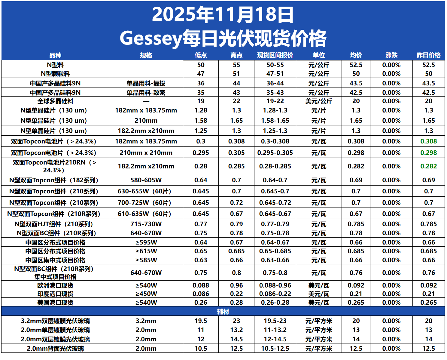 Gessey:11月18日每日光伏市場(chǎng)行情2025-11-18 17:51來(lái)源:gessey瀏覽數(shù):257次