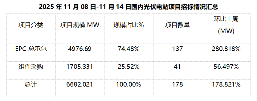 一、光伏項目招標(biāo)情況匯總: 根據(jù)Gessey蓋錫咨詢統(tǒng)計,2025年11月08日-11月14日累計光伏招標(biāo)項目為178個,項目規(guī)模合計為6682.021MW。光伏組件采購招標(biāo)項目為41個,招標(biāo)規(guī)模為1705.331MW,,環(huán)比上周56.497%。EPC總承包招標(biāo)項目為137個,招標(biāo)規(guī)模為4976.69MW,環(huán)比上周280.818%。