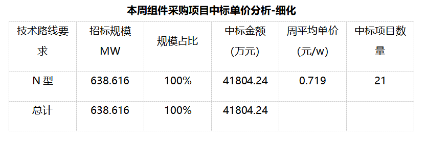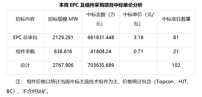 三、EPC總承包及組件采購情況匯總 本月光伏EPC總承包中標(biāo)規(guī)模達(dá)2129.291MW,總中標(biāo)金額661831.448萬元,平均中標(biāo)單價為3.18元/W,中標(biāo)數(shù)量81個。 本月光伏組件采購中標(biāo)規(guī)模達(dá)638.616MW,總中標(biāo)金額41804.24萬元,平均中標(biāo)單價為元0.71/W,中標(biāo)數(shù)量21個。