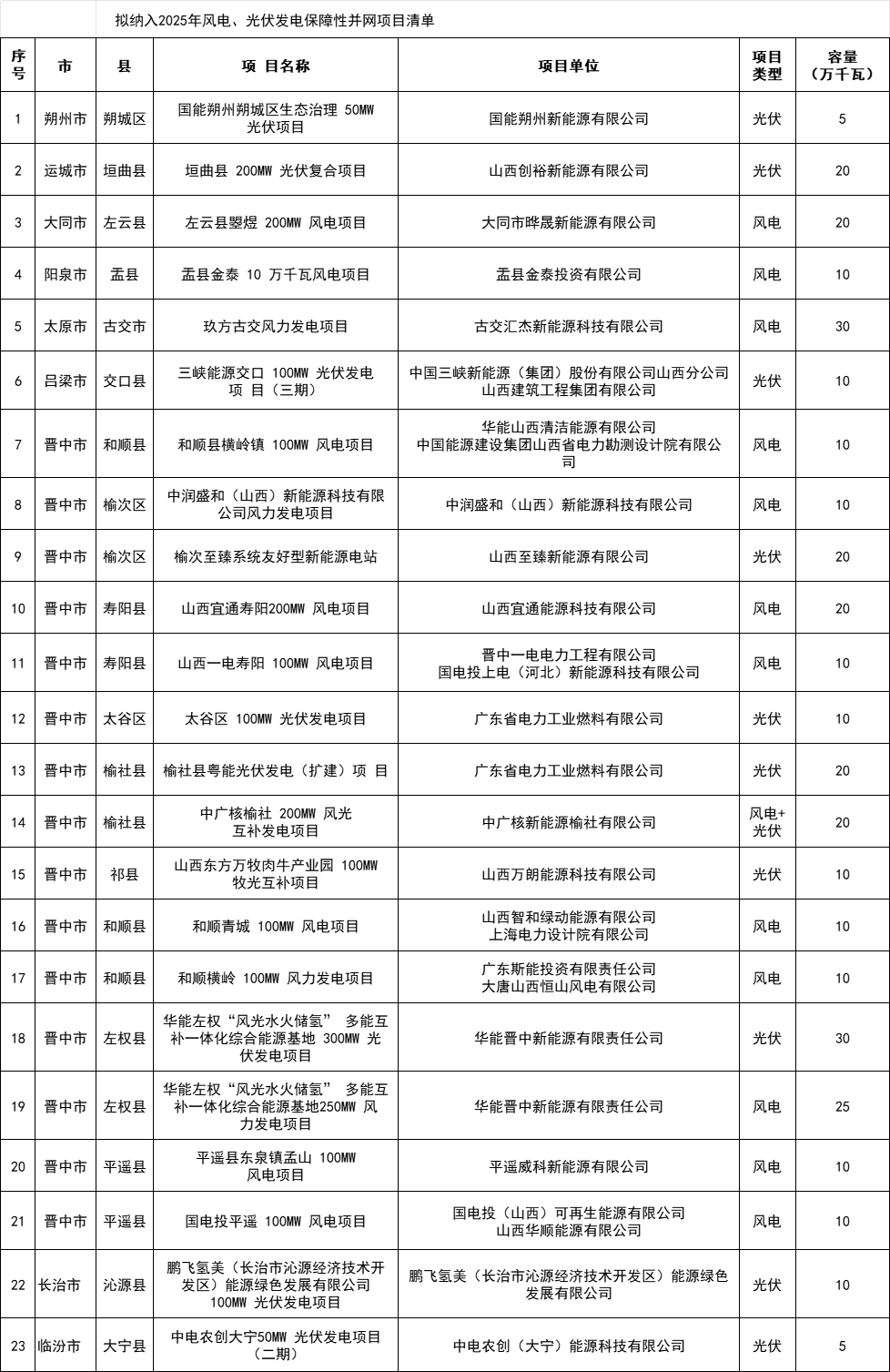 12月5日,山西省能源局發(fā)布《關(guān)于山西省2025年競爭性配置風(fēng)電、光伏發(fā)電項目評審結(jié)果的公示》。 2025年競爭性配置風(fēng)電、光伏發(fā)電項目評審,選出符合新能源“標(biāo)準(zhǔn)地”要求的保障性并網(wǎng)項目23個、規(guī)模335萬千瓦。其中,風(fēng)電項目12個,規(guī)模175萬千瓦;光伏項目10個,規(guī)模140萬千瓦;風(fēng)電+光伏項目1個,規(guī)模20萬千瓦。 從業(yè)主來看,華能集團獲得650MW風(fēng)光項目,廣東省能源集團、上海玖方管理咨詢合伙企業(yè)(有限合伙)分別斬獲300MW,山西宏煜新能源有限公司、山西宜通能源科技有限公司、山西曌煜新能源發(fā)展有限公司、資裕(北京)投資管理有限公司、中廣核則分別獲得200MW。 詳請見下: 關(guān)于山西省2025年競爭性配置風(fēng)電、光伏發(fā)電項目評審結(jié)果的公示 根據(jù)《山西省2025年風(fēng)電、光伏發(fā)電開發(fā)建設(shè)競爭性配置工作方案》,經(jīng)各市初選上報,省能源局組織了2025年競爭性配置風(fēng)電、光伏發(fā)電項目評審,選出符合新能源“標(biāo)準(zhǔn)地”要求的保障性并網(wǎng)項目23個、規(guī)模335萬千瓦,現(xiàn)將結(jié)果予以公示。 公示時間為2025年12月5至12月11日。如有異議,請在公示期內(nèi)向項目所在市能源局提出書面意見,各市匯總上報省能源局。 聯(lián)系電話:0351-4117220 電子郵箱:sxsnyjxnyc2025@126.com 附件:擬納入2025年風(fēng)電、光伏發(fā)電保障性并網(wǎng)項目清單 山西省能源局 2025年12月5日