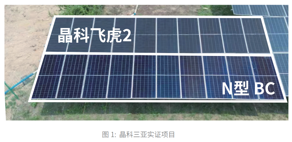 項(xiàng)目設(shè)計(jì): 三亞實(shí)證基地設(shè)計(jì)2個(gè)光伏陣列,各陣列由10塊相同型號(hào)飛虎2組件與N型BC組件構(gòu)成,均采用雙面雙玻結(jié)構(gòu),確保測(cè)試變量單一可控。實(shí)驗(yàn)采用固定支架 (≈15°) 朝南安裝,地面條件為草地,實(shí)驗(yàn)期間持續(xù)采集了發(fā)電量、輻照度、組件溫度、環(huán)境溫度及電氣參數(shù)等關(guān)鍵數(shù)據(jù),并針對(duì)不同時(shí)段、不同輻照條件進(jìn)行了對(duì)比分析。