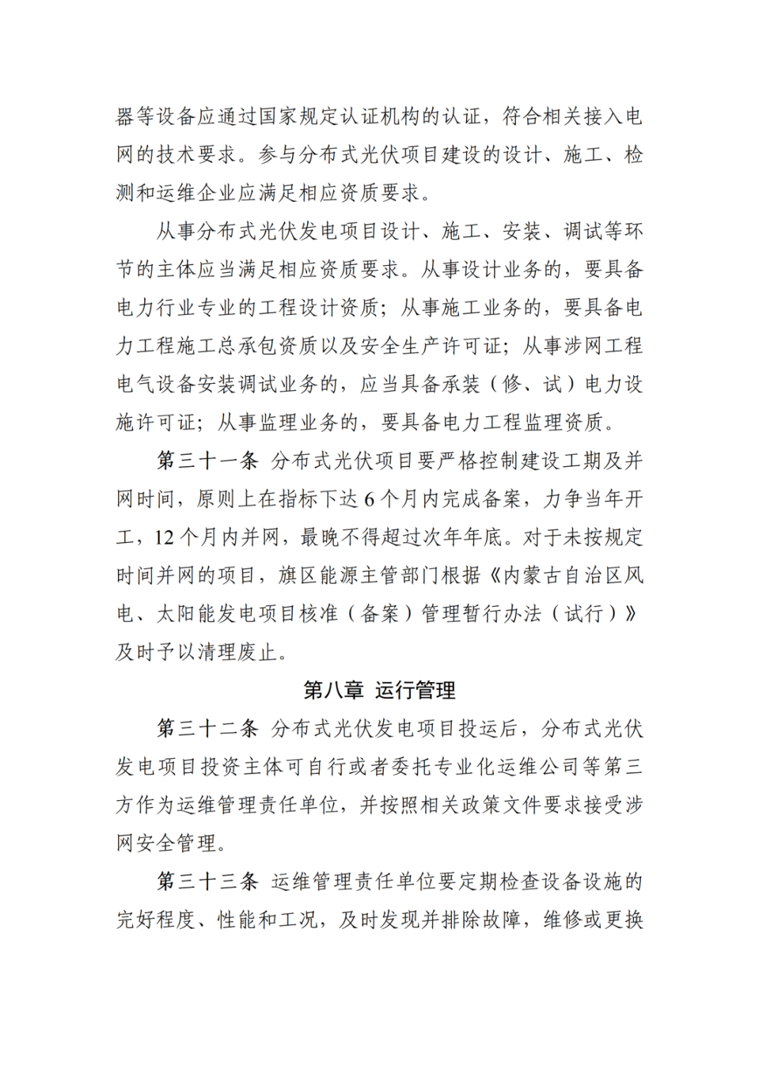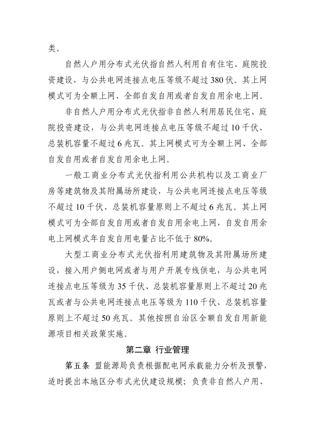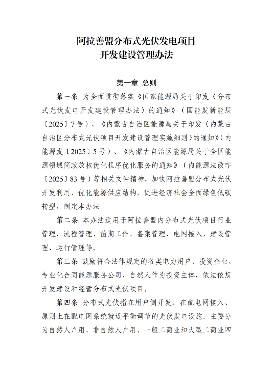 12月15日,阿拉善盟能源局關(guān)于印發(fā)《阿拉善盟分布式光伏發(fā)電項目開發(fā)建設(shè)管理辦法》的通知。 通知對分布式光伏項目行業(yè)管理、流程管理、前期工作、備案管理、電網(wǎng)接入、建設(shè)管理、運行管理等做出詳細(xì)規(guī)定,其中,一般工商業(yè)分布式光伏上網(wǎng)模式可為全部自發(fā)自用或者自發(fā)自用余電上網(wǎng),自發(fā)自用余電上網(wǎng)模式年自發(fā)自用電量占比不低于80%。大型工商業(yè)分布式光伏總裝機容量原則上不超過50兆瓦。 阿拉善盟能源局關(guān)于印發(fā)《阿拉善盟分布式光伏發(fā)電項目開發(fā)建設(shè)管理辦法》的通知 各盟直相關(guān)部門、各旗區(qū)能源主管部門、阿拉善供電公司、各新能源企業(yè): 根據(jù)《國家能源局關(guān)于印發(fā)〈分布式光伏發(fā)電開發(fā)建設(shè)管理辦法〉的通知》(國能發(fā)新能規(guī)〔2025〕7 號)、《內(nèi)蒙古自治區(qū)能源局關(guān)于印發(fā)〈內(nèi)蒙古自治區(qū)分布式光伏項目開發(fā)建設(shè)管理實施細(xì)則〉的通知》(內(nèi)能源發(fā)〔2025〕5 號)、《內(nèi)蒙古自治區(qū)能源局關(guān)于全區(qū)能源領(lǐng)域簡政放權(quán)優(yōu)化程序優(yōu)化服務(wù)的通知》(內(nèi)能源法改字〔2025〕83 號)等政策文件,開展公平競爭審查、合法性審查,并廣泛征求意見,盟能源局制定了《阿拉善盟分布式光伏發(fā)電項目開發(fā)建設(shè)管理辦法》,現(xiàn)公開印發(fā),請各單位及企業(yè)認(rèn)真執(zhí)行。 阿拉善盟能源局 2025年12月15日 附件:阿拉善盟分布式光伏發(fā)電項目開發(fā)建設(shè)管理辦法.docx