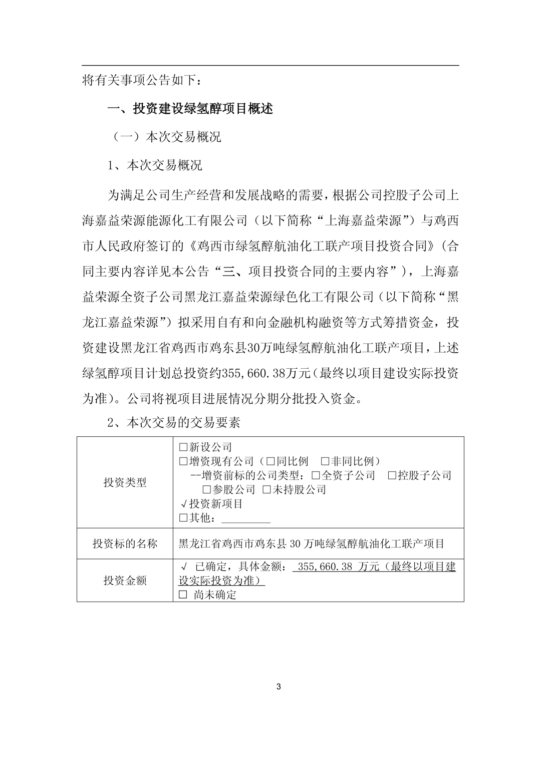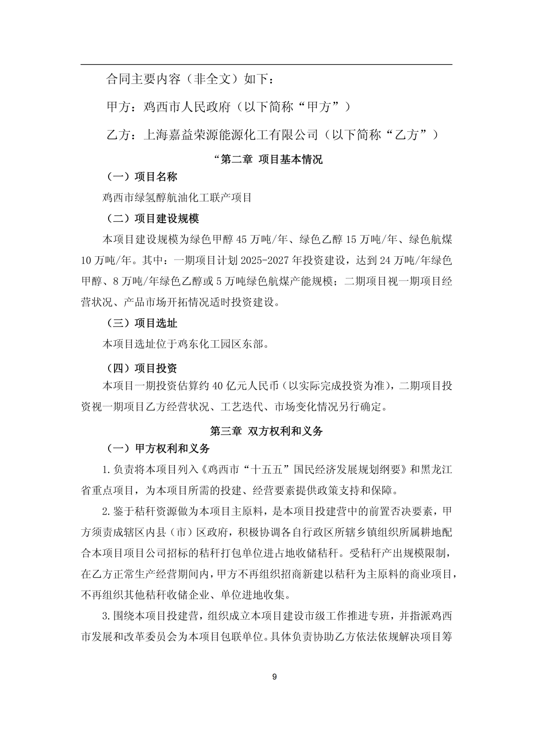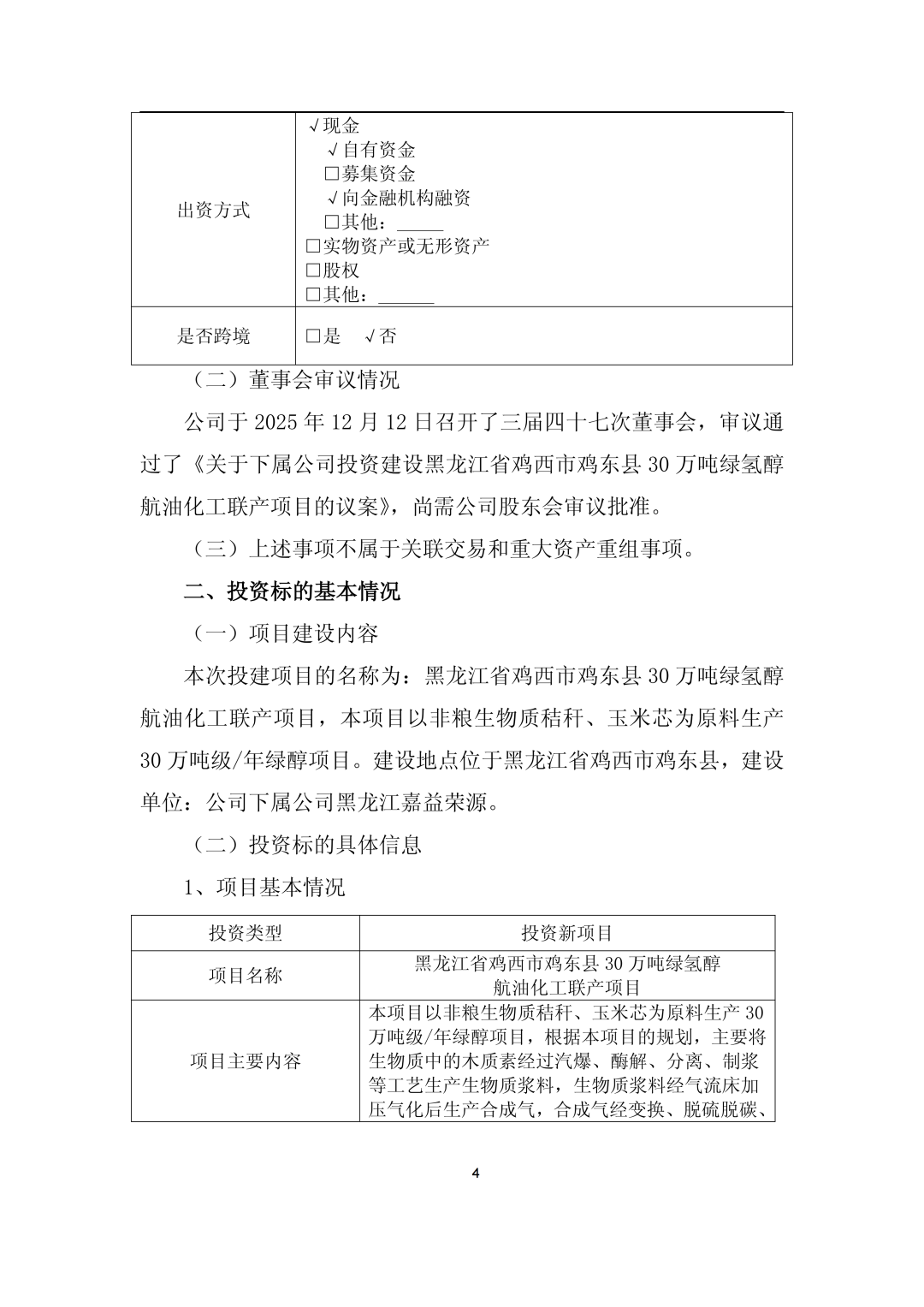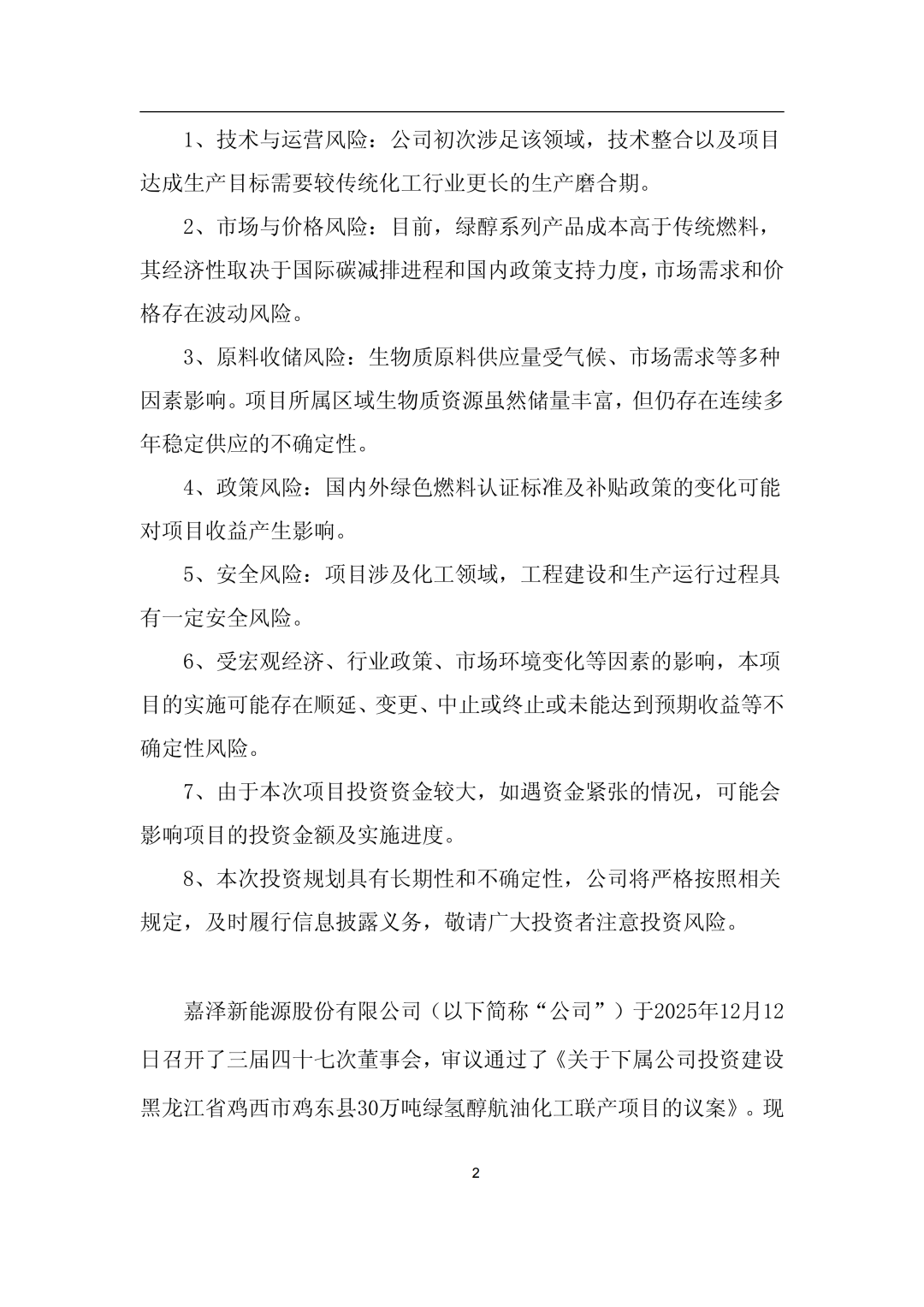 12月15日,嘉澤新能源股份有限公司(簡(jiǎn)稱:嘉澤新能)發(fā)布《嘉澤新能源股份有限公司關(guān)于下屬公司投資建設(shè)黑龍江省雞西市雞東縣30萬(wàn)噸綠氫醇航油化工聯(lián)產(chǎn)項(xiàng)目的公告》。 公告稱,為滿足公司生產(chǎn)經(jīng)營(yíng)和發(fā)展戰(zhàn)略的需要,根據(jù)公司控股子公司上海嘉益榮源能源化工有限公司(以下簡(jiǎn)稱“上海嘉益榮源”)與雞西市人民政府簽訂的《雞西市綠氫醇航油化工聯(lián)產(chǎn)項(xiàng)目投資合同》,上海嘉益榮源全資子公司黑龍江嘉益榮源綠色化工有限公司(簡(jiǎn)稱“黑龍江嘉益榮源”)擬采用自有和向金融機(jī)構(gòu)融資等方式籌措資金,投資建設(shè)黑龍江省雞西市雞東縣30萬(wàn)噸綠氫醇航油化工聯(lián)產(chǎn)項(xiàng)目,上述綠氫醇項(xiàng)目計(jì)劃總投資約355,660.38萬(wàn)元。 嘉澤新能于2025年12月12日召開(kāi)了三屆四十七次董事會(huì),審議通過(guò)了《關(guān)于下屬公司投資建設(shè)黑龍江省雞西市雞東縣30萬(wàn)噸綠氫醇航油化工聯(lián)產(chǎn)項(xiàng)目的議案》,尚需公司股東會(huì)審議批準(zhǔn)。 公告顯示,雞西市綠氫醇航油化工聯(lián)產(chǎn)項(xiàng)目位于雞東化工園區(qū)東部,建設(shè)規(guī)模為綠色甲醇45萬(wàn)噸/年、綠色乙醇15萬(wàn)噸/年、綠色航煤10萬(wàn)噸/年。 其中:一期項(xiàng)目計(jì)劃2025-2027年投資建設(shè),達(dá)到24萬(wàn)噸/年綠色甲醇、8萬(wàn)噸/年綠色乙醇或5萬(wàn)噸綠色航煤產(chǎn)能規(guī)模;二期項(xiàng)目視一期項(xiàng)目經(jīng)營(yíng)狀況、產(chǎn)品市場(chǎng)開(kāi)拓情況適時(shí)投資建設(shè)。 項(xiàng)目已完成前期可行性研究,可研報(bào)告已在當(dāng)?shù)赜嘘P(guān)部門完成項(xiàng)目備案。目前正在開(kāi)展項(xiàng)目前期準(zhǔn)備工作,已取得控制性詳細(xì)規(guī)劃、成片開(kāi)發(fā)方案、勘測(cè)定界、地形圖測(cè)量、詳細(xì)勘察、凈空評(píng)估及環(huán)境影響評(píng)價(jià)等前期手續(xù),正在推進(jìn)安全預(yù)評(píng)價(jià)、節(jié)能評(píng)估、社會(huì)穩(wěn)定風(fēng)險(xiǎn)評(píng)估、職業(yè)病危害評(píng)價(jià)、水土保持方案編制等工作,后續(xù)將根據(jù)建設(shè)計(jì)劃逐步實(shí)施。 公司計(jì)劃近期全面啟動(dòng)工程手續(xù)申報(bào)、土地出讓、詳細(xì)設(shè)計(jì)、長(zhǎng)周期設(shè)備采購(gòu)等各項(xiàng)工作,計(jì)劃于2026年5月開(kāi)始土建施工,計(jì)劃于2027年10月完成全部土建及設(shè)備安裝工作,進(jìn)入調(diào)試運(yùn)行階段,并計(jì)劃于2027年底啟動(dòng)生產(chǎn)。 嘉澤新能表示,本次項(xiàng)目投資積極響應(yīng)了國(guó)家雙碳戰(zhàn)略的號(hào)召,符合公司發(fā)展戰(zhàn)略。作為公司打通新能源產(chǎn)業(yè)鏈、拓寬應(yīng)用場(chǎng)景、增加新業(yè)績(jī)?cè)鲩L(zhǎng)點(diǎn)的首個(gè)綠色化工項(xiàng)目,項(xiàng)目的建設(shè)不僅標(biāo)志著公司在綠色化工領(lǐng)域邁出關(guān)鍵一步,更將充分發(fā)揮示范引領(lǐng)作用,助力公司綠色化工業(yè)務(wù)板塊的整體布局和加速發(fā)展。 公告如下: