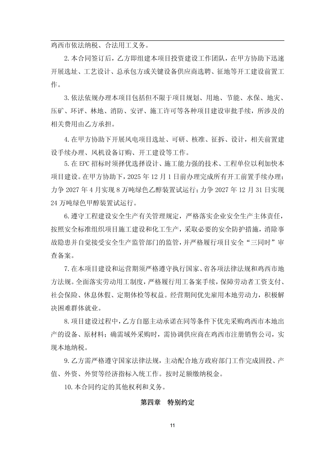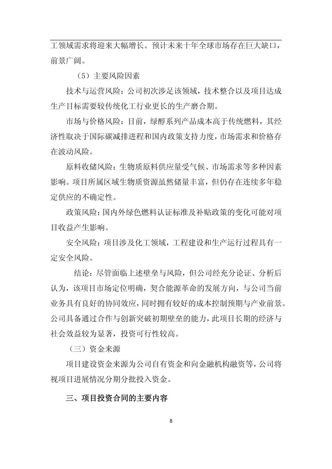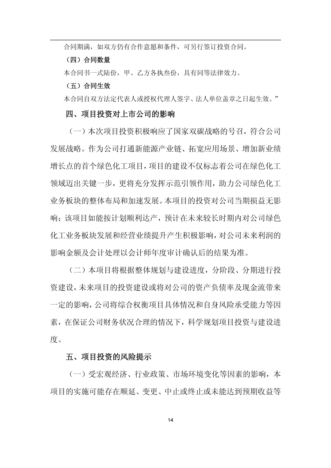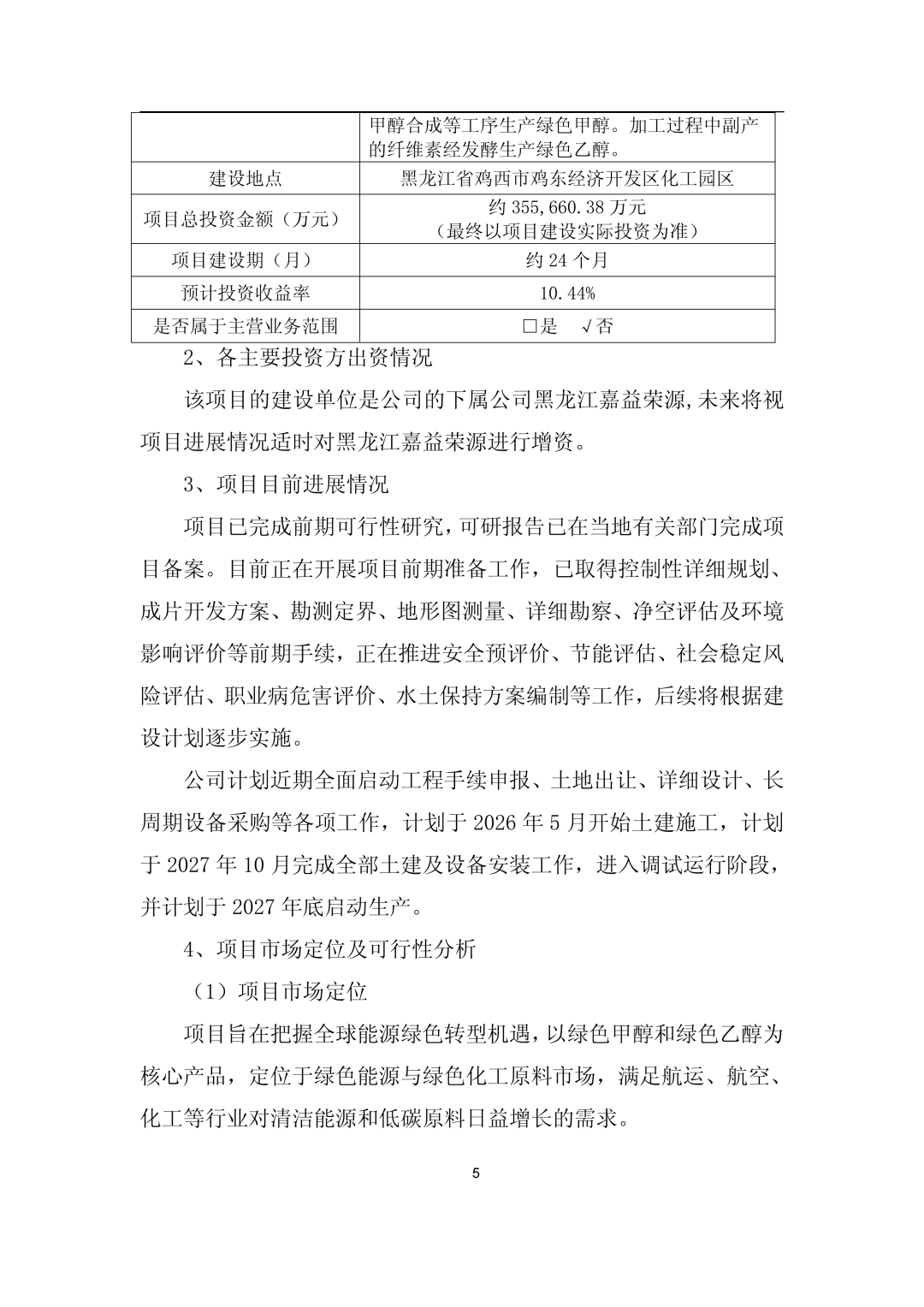 12月15日,嘉澤新能源股份有限公司(簡(jiǎn)稱:嘉澤新能)發(fā)布《嘉澤新能源股份有限公司關(guān)于下屬公司投資建設(shè)黑龍江省雞西市雞東縣30萬(wàn)噸綠氫醇航油化工聯(lián)產(chǎn)項(xiàng)目的公告》。 公告稱,為滿足公司生產(chǎn)經(jīng)營(yíng)和發(fā)展戰(zhàn)略的需要,根據(jù)公司控股子公司上海嘉益榮源能源化工有限公司(以下簡(jiǎn)稱“上海嘉益榮源”)與雞西市人民政府簽訂的《雞西市綠氫醇航油化工聯(lián)產(chǎn)項(xiàng)目投資合同》,上海嘉益榮源全資子公司黑龍江嘉益榮源綠色化工有限公司(簡(jiǎn)稱“黑龍江嘉益榮源”)擬采用自有和向金融機(jī)構(gòu)融資等方式籌措資金,投資建設(shè)黑龍江省雞西市雞東縣30萬(wàn)噸綠氫醇航油化工聯(lián)產(chǎn)項(xiàng)目,上述綠氫醇項(xiàng)目計(jì)劃總投資約355,660.38萬(wàn)元。 嘉澤新能于2025年12月12日召開(kāi)了三屆四十七次董事會(huì),審議通過(guò)了《關(guān)于下屬公司投資建設(shè)黑龍江省雞西市雞東縣30萬(wàn)噸綠氫醇航油化工聯(lián)產(chǎn)項(xiàng)目的議案》,尚需公司股東會(huì)審議批準(zhǔn)。 公告顯示,雞西市綠氫醇航油化工聯(lián)產(chǎn)項(xiàng)目位于雞東化工園區(qū)東部,建設(shè)規(guī)模為綠色甲醇45萬(wàn)噸/年、綠色乙醇15萬(wàn)噸/年、綠色航煤10萬(wàn)噸/年。 其中:一期項(xiàng)目計(jì)劃2025-2027年投資建設(shè),達(dá)到24萬(wàn)噸/年綠色甲醇、8萬(wàn)噸/年綠色乙醇或5萬(wàn)噸綠色航煤產(chǎn)能規(guī)模;二期項(xiàng)目視一期項(xiàng)目經(jīng)營(yíng)狀況、產(chǎn)品市場(chǎng)開(kāi)拓情況適時(shí)投資建設(shè)。 項(xiàng)目已完成前期可行性研究,可研報(bào)告已在當(dāng)?shù)赜嘘P(guān)部門完成項(xiàng)目備案。目前正在開(kāi)展項(xiàng)目前期準(zhǔn)備工作,已取得控制性詳細(xì)規(guī)劃、成片開(kāi)發(fā)方案、勘測(cè)定界、地形圖測(cè)量、詳細(xì)勘察、凈空評(píng)估及環(huán)境影響評(píng)價(jià)等前期手續(xù),正在推進(jìn)安全預(yù)評(píng)價(jià)、節(jié)能評(píng)估、社會(huì)穩(wěn)定風(fēng)險(xiǎn)評(píng)估、職業(yè)病危害評(píng)價(jià)、水土保持方案編制等工作,后續(xù)將根據(jù)建設(shè)計(jì)劃逐步實(shí)施。 公司計(jì)劃近期全面啟動(dòng)工程手續(xù)申報(bào)、土地出讓、詳細(xì)設(shè)計(jì)、長(zhǎng)周期設(shè)備采購(gòu)等各項(xiàng)工作,計(jì)劃于2026年5月開(kāi)始土建施工,計(jì)劃于2027年10月完成全部土建及設(shè)備安裝工作,進(jìn)入調(diào)試運(yùn)行階段,并計(jì)劃于2027年底啟動(dòng)生產(chǎn)。 嘉澤新能表示,本次項(xiàng)目投資積極響應(yīng)了國(guó)家雙碳戰(zhàn)略的號(hào)召,符合公司發(fā)展戰(zhàn)略。作為公司打通新能源產(chǎn)業(yè)鏈、拓寬應(yīng)用場(chǎng)景、增加新業(yè)績(jī)?cè)鲩L(zhǎng)點(diǎn)的首個(gè)綠色化工項(xiàng)目,項(xiàng)目的建設(shè)不僅標(biāo)志著公司在綠色化工領(lǐng)域邁出關(guān)鍵一步,更將充分發(fā)揮示范引領(lǐng)作用,助力公司綠色化工業(yè)務(wù)板塊的整體布局和加速發(fā)展。 公告如下: