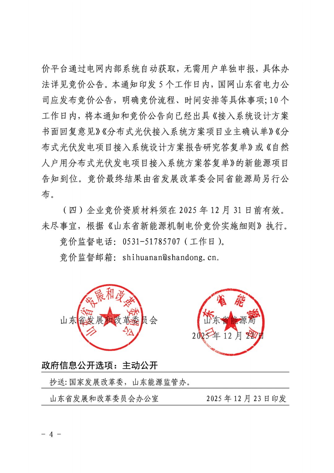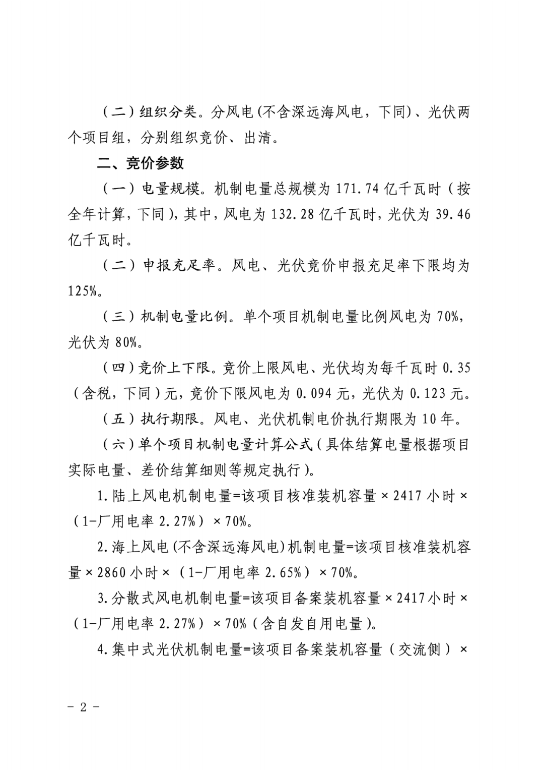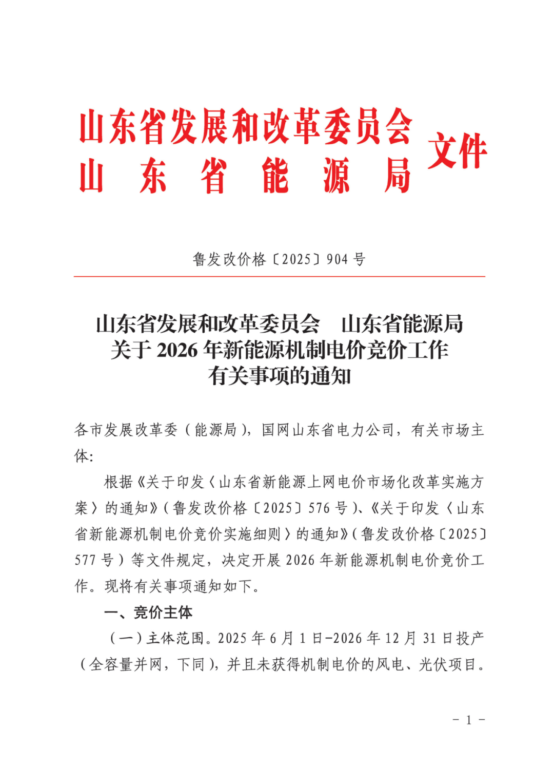 12月22日,山東省發(fā)改委、山東省能源局發(fā)布《關(guān)于2026年新能源機(jī)制電價(jià)競(jìng)價(jià)工作有關(guān)事項(xiàng)的通知》。根據(jù)文件,本次競(jìng)價(jià)主體為2025年6月1日-2026年12月31日投產(chǎn)(全容量并網(wǎng),下同),并且未獲得機(jī)制電價(jià)的風(fēng)電、光伏項(xiàng)目,分風(fēng)電(不含深遠(yuǎn)海風(fēng)電,下同)、光伏兩個(gè)項(xiàng)目組,分別組織競(jìng)價(jià)、出清。 電量規(guī)模:機(jī)制電量總規(guī)模為171.74億千瓦時(shí)(按全年計(jì)算,下同),其中,風(fēng)電為132.28億千瓦時(shí),光伏為39.46億千瓦時(shí)。 申報(bào)充足率:風(fēng)電、光伏競(jìng)價(jià)申報(bào)充足率下限均為125%。 機(jī)制電量比例:?jiǎn)蝹€(gè)項(xiàng)目機(jī)制電量比例風(fēng)電為70%,光伏為80%。 競(jìng)價(jià)上下限:競(jìng)價(jià)上限風(fēng)電、光伏均為每千瓦時(shí)0.35(含稅,下同)元,競(jìng)價(jià)下限風(fēng)電為0.094元,光伏為0.123元。 執(zhí)行期限:風(fēng)電、光伏機(jī)制電價(jià)執(zhí)行期限為10年。 值得重視的是,在其他事項(xiàng)中,文件明確,自2027年起,“戶用非自然人分布式光伏項(xiàng)目”不再納入機(jī)制電價(jià)競(jìng)價(jià)范圍。 文件如下: