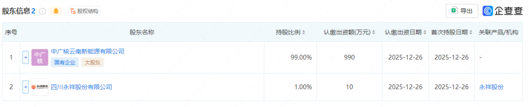 據(jù)企查查股權穿透顯示,該公司由中廣核集團旗下中廣核云南新能源有限公司、通威股份旗下四川永祥股份有限公司共同持股。