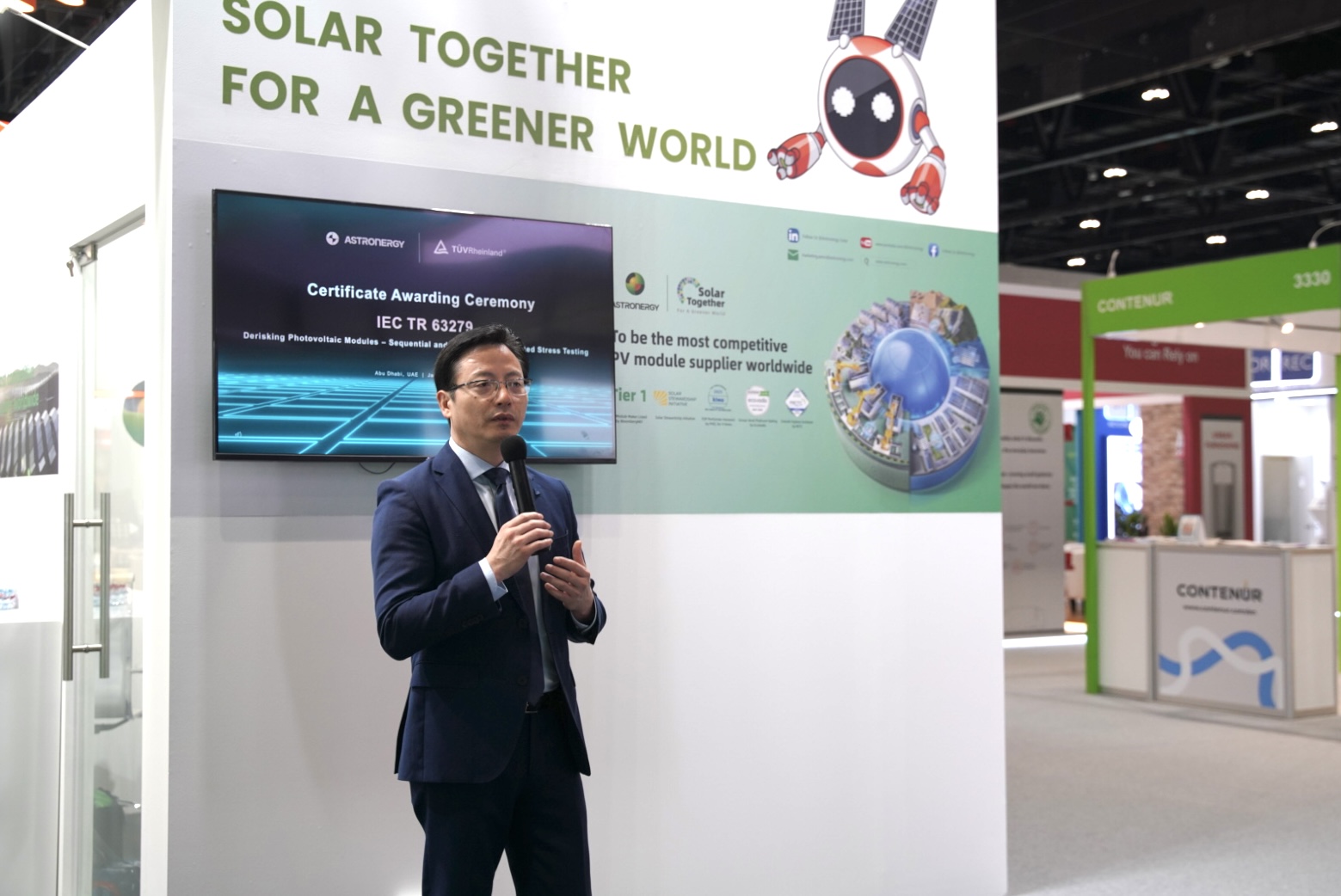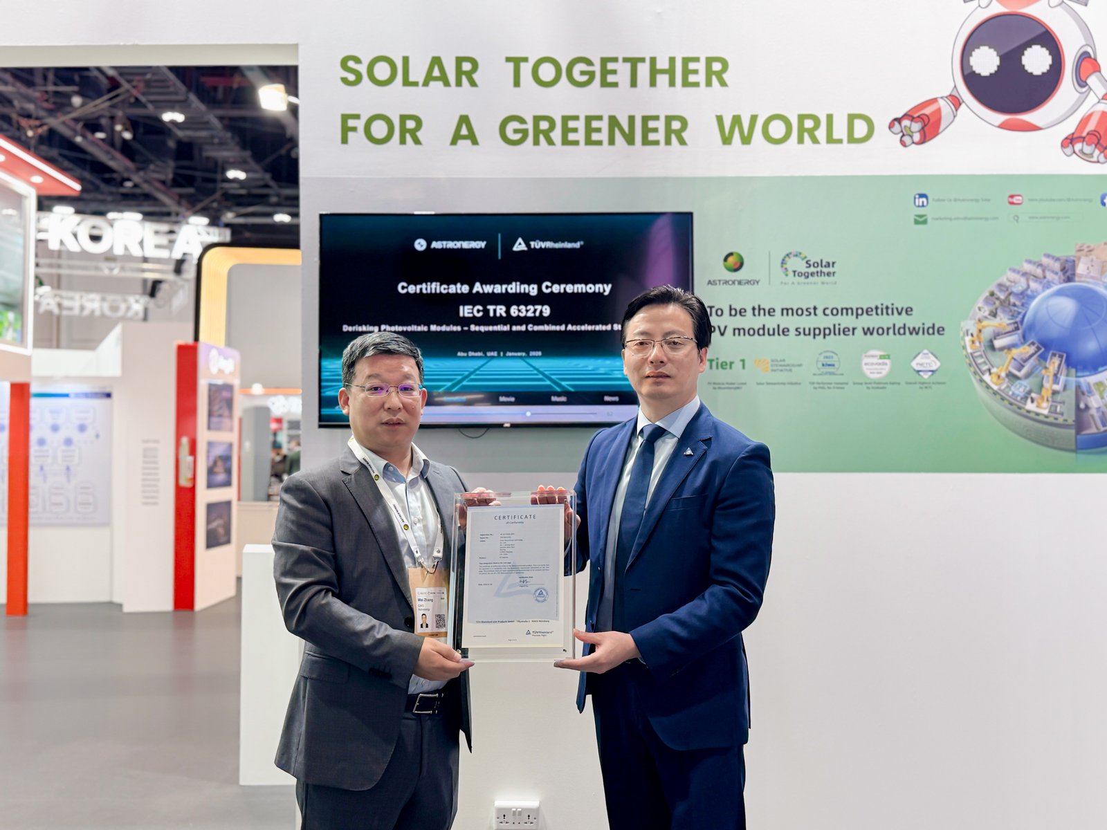1月13日,在阿聯(lián)酋阿布扎比舉辦的世界未來(lái)能源峰會(huì)(World Future Energy Summit 2026)現(xiàn)場(chǎng),正泰新能正式獲頒由國(guó)際獨(dú)立第三方檢測(cè)、檢驗(yàn)和認(rèn)證機(jī)構(gòu)德國(guó)萊茵TüV大中華區(qū)(以下簡(jiǎn)稱“TüV萊茵”)頒發(fā)的全球首張n-TOPCon組件IEC TR 63279 序列及綜合加速應(yīng)力測(cè)試證書(shū)。 德國(guó)萊茵TüV大中華區(qū)太陽(yáng)能與商業(yè)產(chǎn)品服務(wù)高級(jí)副總裁兼全球電力電子產(chǎn)品服務(wù)高級(jí)副總裁李衛(wèi)春,與正泰新能首席市場(chǎng)營(yíng)銷官?gòu)垷樄餐鱿瘍x式,見(jiàn)證了這一里程碑時(shí)刻。