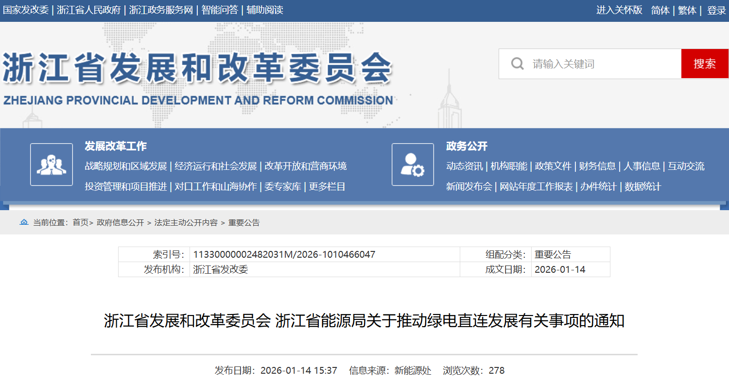 浙江省發(fā)展和改革委員會(huì)、浙江省能源局發(fā)布關(guān)于推動(dòng)綠電直連發(fā)展有關(guān)事項(xiàng)的通知2026-01-15 14:34來源:gessey瀏覽數(shù):226次