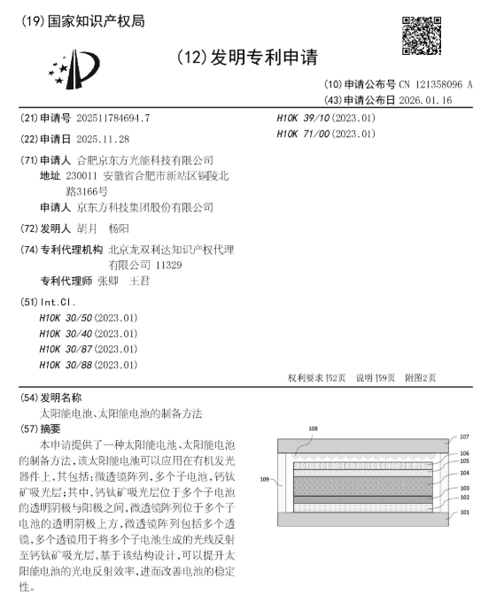 專利摘要:本申請?zhí)峁┝艘环N太陽能電池、太陽能電池的制備方法,該太陽能電池可以應(yīng)用在有機(jī)發(fā)光器件上,其包括:微透鏡陣列,多個(gè)子電池,鈣鈦礦吸光層;其中,鈣鈦礦吸光層位于多個(gè)子電池的透明陰極與陽極之間,微透鏡陣列位于多個(gè)子電池的透明陰極上方,微透鏡陣列包括多個(gè)透鏡,多個(gè)透鏡用于將多個(gè)子電池生成的光線反射至鈣鈦礦吸光層,基于該結(jié)構(gòu)設(shè)計(jì),可以提升太陽能電池的光電反射效率,進(jìn)而改善電池的穩(wěn)定性。 2026年1月13日,合肥京東方光能科技有限公司與京東方科技集團(tuán)股份有限公司申請的另外兩項(xiàng)鈣鈦礦專利同時(shí)公布: 一種鈣鈦礦電池模組及其制備方法,202511832415X 本申請?zhí)峁┝艘环N鈣鈦礦電池模組及其制備方法,應(yīng)用于太陽能電池技術(shù)領(lǐng)域,該鈣鈦礦電池模組包括:襯底;多個(gè)子電池,多個(gè)子電池覆蓋襯底,子電池包括沿第一方向間隔設(shè)置的第一凹槽和第二凹槽,子電池還包括沿第二方向依次設(shè)置的導(dǎo)電層、空穴傳輸層、鈣鈦礦層、電子傳輸層和背電極層,其中,導(dǎo)電層覆蓋襯底,空穴傳輸層覆蓋導(dǎo)電層和襯底,電子傳輸層位于鈣鈦礦層遠(yuǎn)離空穴傳輸層的一側(cè)和鈣鈦礦層的側(cè)壁,背電極層覆蓋電子傳輸層,背電極層還覆蓋第一凹槽的側(cè)壁和底部,以及第二凹槽的部分側(cè)壁,第一方向是襯底表面的水平面的方向,第二方向是垂直于襯底表面的方向。本申請的鈣鈦礦電池模組能夠提高鈣鈦礦電池的穩(wěn)定性。 一種鈣鈦礦電池組件及其制備方法,2025118324893 本申請?zhí)峁┝艘环N鈣鈦礦電池組件及其制備方法,該鈣鈦礦電池組件包括:第一電極層;功能層,位于第一電極層的一側(cè),功能層在沿遠(yuǎn)離第一電極層的方向上依次設(shè)置有空穴層、第一鈣鈦礦層、第一介質(zhì)層和電子傳輸層,第一介質(zhì)層包括不與第二電極層產(chǎn)生反應(yīng)的介質(zhì),功能層設(shè)有第一開口,第一介質(zhì)層覆蓋第一開口的側(cè)壁的部分;第二電極層,位于功能層遠(yuǎn)離第一電極層的一側(cè),第二電極層的材料還填充第一開口。本申請?zhí)峁┑姆桨缚梢员苊忖}鈦礦層直接接觸陰極,以避免腐蝕陰極,從而可以提升鈣鈦礦電池組件的性能。