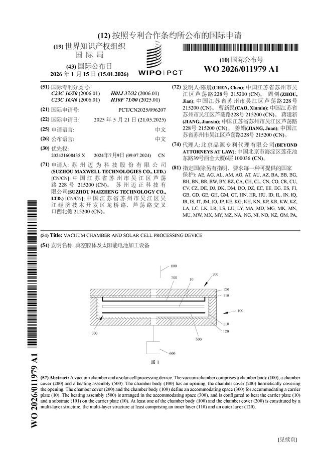 根據(jù)企查查數(shù)據(jù)顯示邁為股份(300751)公布了一項國際專利申請,專利名為“真空腔體及太陽能電池加工設(shè)備”,專利申請?zhí)枮镻CT/CN2025/096207,國際公布日為2026年1月15日。