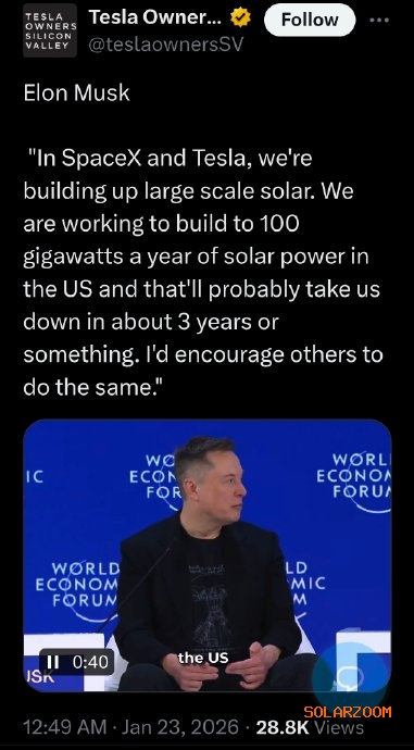 馬斯克稱將建100GW太陽能電力2026-01-26 15:18來源:gessey瀏覽數(shù):262次