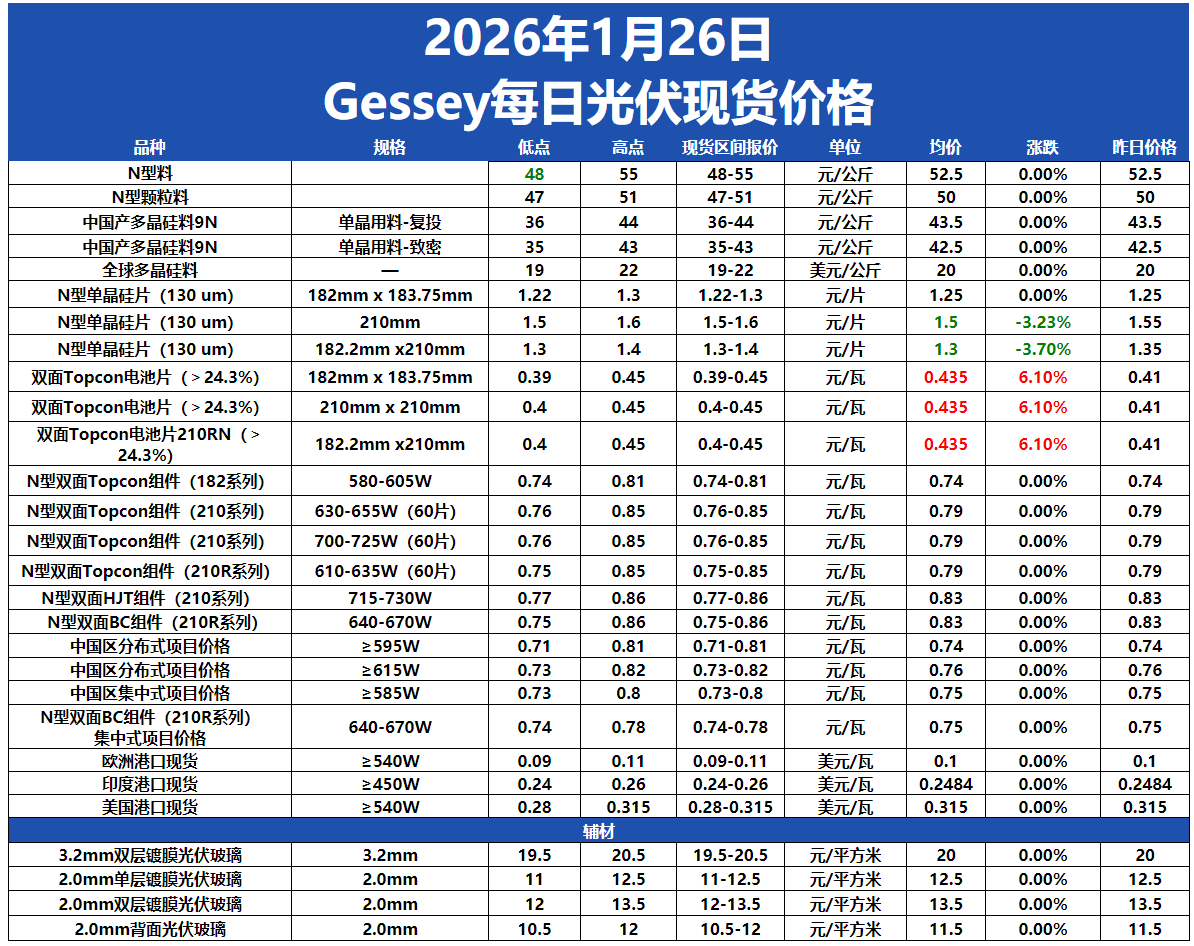今日組件價格整體維穩(wěn),N型雙面Topcon 組件(182系列)價格在0.74-0.81元/ 瓦,均價為0.74元/瓦。N型雙面Topcon 組件(210系列)價格在0.76-0.85元/ 瓦,均價為0.79元/瓦。N型雙面Topcon組件(210系列)(700-725W(60片)價格在0.76-0.85元/ 瓦,均價為0.79元/瓦。N型雙面Topcon組件(210R系列)(610-635W(60片))價格在0.75-0.85元/ 瓦,均價為0.79元/瓦。N型雙面HJT組件(210系列)價格在0.77-0.86元/ 瓦,均價為0.83元/瓦。N型雙面BC組件(210R系列)價格在0.75-0.86元/ 瓦,均價為0.83元/瓦。中國區(qū)分布式項目(≥595W)價格在0.71-0.81元/瓦,均價為0.74元/瓦,中國區(qū)分布式項目(≥615W)價格在0.73-0.82元/瓦,均價為0.76元/瓦,中國區(qū)集中式項目(≥585W)價格在0.73-0.8元/ 瓦,均價為0.75元/瓦。N型雙面BC組件(210R系列)集中式項目價格在0.74-0.78元/ 瓦,均價為0.75元/瓦。歐洲港口現(xiàn)貨價格在0.09-0.11美元/ 瓦,均價為0.1美元/瓦。印度港口現(xiàn)貨價格在0.24-0.26美元/ 瓦,均價為0.2484美元/瓦。美國港口現(xiàn)貨價格在0.28-0.315美元/ 瓦,均價為0.315美元/瓦。