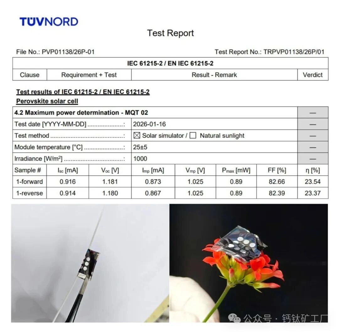 55 W/g!量級(jí)革命,刷新人類光伏功質(zhì)比最高紀(jì)錄鈣鈦礦太陽能電池(PSCs)憑借其卓越的光電特性,成為制備高功質(zhì)比器件的理想載體。公司科研團(tuán)隊(duì)自2019年起深耕大功質(zhì)比超輕量柔性鈣鈦礦技術(shù)領(lǐng)域,歷經(jīng)數(shù)年技術(shù)攻關(guān),多次刷新行業(yè)紀(jì)錄。2026年1月28日,經(jīng)TüV北德認(rèn)證,團(tuán)隊(duì)制備的高功質(zhì)比柔性光伏器件實(shí)現(xiàn)了: 光電轉(zhuǎn)換效率:23.37% 厚度:1.6 μm 功質(zhì)比:55 W/g 這一數(shù)據(jù)刷新了人類已公開報(bào)道的光伏技術(shù)功質(zhì)比紀(jì)錄,是目前已知最高水平的輕質(zhì)光伏技術(shù),標(biāo)志著空間能源系統(tǒng)在“每克重量都要精打細(xì)算”的極端約束下,邁出了從概念走向工程現(xiàn)實(shí)的關(guān)鍵一步。 超輕量高功質(zhì)比光伏技術(shù)被認(rèn)為是光伏領(lǐng)域的終極方向,試想,重量1公斤的光伏器件每小時(shí)可以產(chǎn)生55KWh的電力,不僅能讓地球上的移動(dòng)能源實(shí)現(xiàn)真正的“用電自由”,更將成為未來月球科研站與火星基地能源系統(tǒng)的核心支柱,為地外文明的建設(shè)提供源源不斷的綠色動(dòng)力。