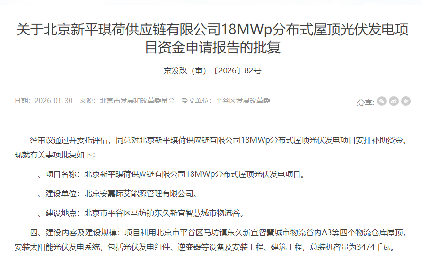 1月30日,北京市發(fā)改委發(fā)布《關(guān)于北京新平琪荷供應(yīng)鏈有限公司18MWp分布式屋頂光伏發(fā)電項(xiàng)目資金申請報(bào)告的批復(fù)》,同意向北京新平琪荷供應(yīng)鏈有限公司18MWp分布式屋頂光伏發(fā)電項(xiàng)目安排補(bǔ)助資金。據(jù)悉,項(xiàng)目建設(shè)單位為北京安嘉際艾能源管理有限公司,建設(shè)地點(diǎn)在北京市平谷區(qū)馬坊鎮(zhèn)東久新宜智慧城市物流谷。項(xiàng)目利用北京市平谷區(qū)馬坊鎮(zhèn)東久新宜智慧城市物流谷內(nèi)A3等四個(gè)物流倉庫屋頂,安裝太陽能光伏發(fā)電系統(tǒng),包括光伏發(fā)電組件、逆變器等設(shè)備及安裝工程、建筑工程,總裝機(jī)容量為3474千瓦。
