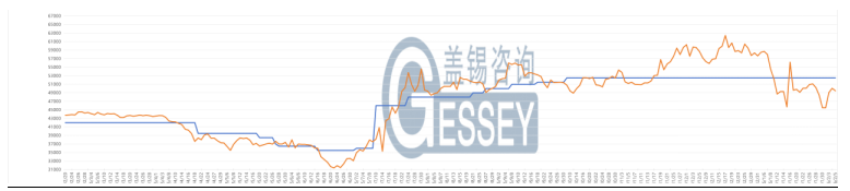 行情走勢:主力合約收盤價為49490元 / 噸,前結算價為50140元/噸,收盤價較前結算價跌幅為1.30% ,收盤價較開盤價跌0元/噸,跌幅為0.00%,成交量為25手,持倉量為120手。