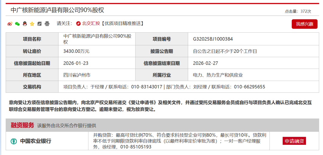 近日。北京產(chǎn)權(quán)交易所近日集中披露兩宗新能源公司股權(quán)轉(zhuǎn)讓項(xiàng)目,涉及中廣核與南方電網(wǎng)旗下子公司。 項(xiàng)目一:中廣核新能源瀘縣有限公司90%股權(quán) 轉(zhuǎn)讓方:中廣核風(fēng)電有限公司(國務(wù)院國資委監(jiān)管) 掛牌底價(jià):3430萬元 信息披露期:2026年1月23日至2026年2月27日 股東:中廣核風(fēng)電有限公司90%、瀘縣經(jīng)源能源有限公司10% 資產(chǎn)規(guī)模:標(biāo)的企業(yè)成立于2022年,注冊資本4500萬元(實(shí)繳4148萬元),主營光伏、風(fēng)電等清潔能源業(yè)務(wù),屬四川瀘州重點(diǎn)扶持的電力供應(yīng)企業(yè)。 特殊條款:受讓方需承接轉(zhuǎn)讓方對(duì)標(biāo)的企業(yè)的794.35萬元債權(quán),并承諾不再使用“中廣核”品牌資質(zhì);另需完成剩余330萬元注冊資本實(shí)繳。