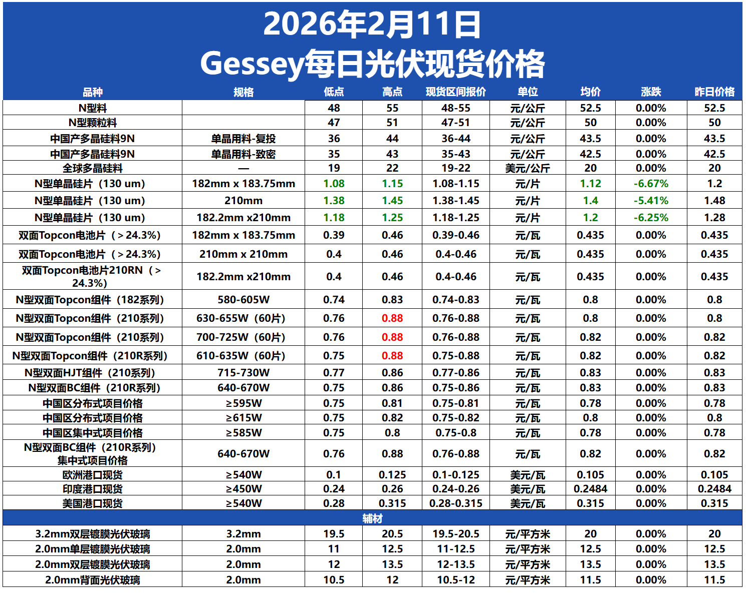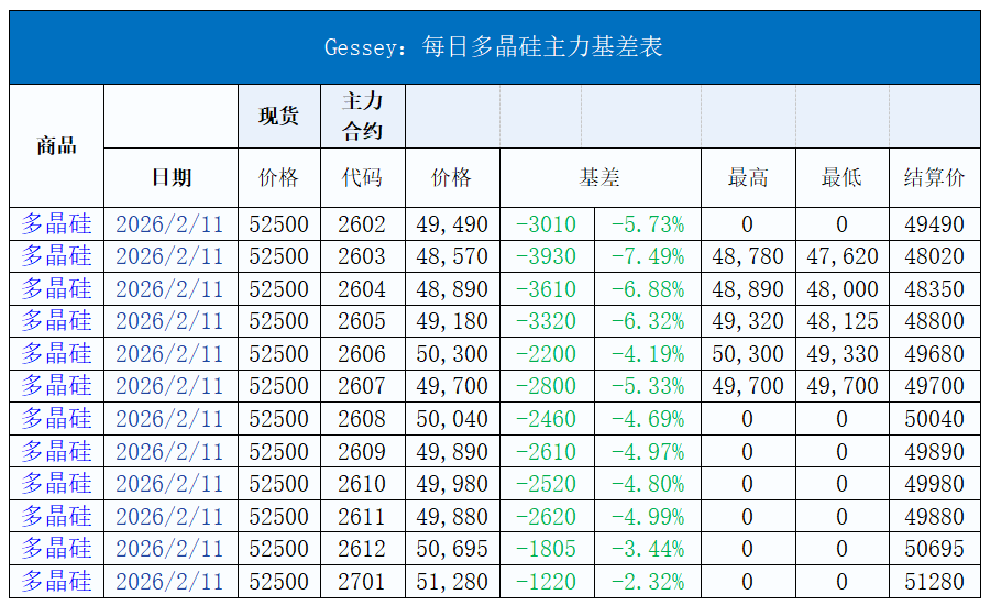 現(xiàn)貨市場價格變動: 多晶硅: 今日硅料價格整體維穩(wěn),N型料主流價格在48-55元/公斤,均價52.5元/公斤。N型顆粒硅主流價格在47-51元/公斤,均價50元/公斤。國產(chǎn)復(fù)投特級硅料主流價格在36-44元/公斤,均價43.5元/公斤,國產(chǎn)致密特級硅料主流價格在35-43元/公斤,均價42.5元/公斤。全球多晶硅料主流價格在19-22元/公斤,均價20元/公斤。 硅片: 今日硅片價格小幅下跌,N型-183.75mm單晶硅片主流現(xiàn)貨價格維持1.08-1.15元/片,均價1.12元/片,下跌6.67%。N型-210mm單晶硅片主流現(xiàn)貨價格維持1.38-1.45元/片,均價1.4元/片,下跌5.41%。N型-210Rmm單晶硅片主流現(xiàn)貨價格1.18-1.25元/片,均價1.2元/片,下跌6.25%。 電池片: 今日電池片價格整體維穩(wěn),24.3%以上183.75mm雙面Topcon電池片主流價格在0.39-0.46元/瓦,均價0.435元/瓦。24.3%以上210mm雙面Topcon電池片主流價格在0.4-0.46元/瓦,均價0.435元/瓦。24.3%以上210Rmm雙面Topcon電池片主流價格在0.4-0.46元/瓦,均價0.435元/瓦。 組件: 今日組件價格整體維穩(wěn),N型雙面Topcon 組件(182系列)價格在0.74-0.83元/ 瓦,均價為0.8元/瓦。N型雙面Topcon 組件(210系列)價格在0.76-0.85元/ 瓦,均價為0.8元/瓦。N型雙面Topcon組件(210系列)(700-725W(60片)價格在0.76-0.85元/ 瓦,均價為0.82元/瓦。N型雙面Topcon組件(210R系列)(610-635W(60片))價格在0.75-0.85元/ 瓦,均價為0.82元/瓦。N型雙面HJT組件(210系列)價格在0.77-0.86元/ 瓦,均價為0.83元/瓦。N型雙面BC組件(210R系列)價格在0.75-0.86元/ 瓦,均價為0.83元/瓦。中國區(qū)分布式項目(≥595W)價格在0.75-0.81元/瓦,均價為0.78元/瓦,中國區(qū)分布式項目(≥615W)價格在0.75-0.82元/瓦,均價為0.8元/瓦,中國區(qū)集中式項目(≥585W)價格在0.75-0.8元/ 瓦,均價為0.78元/瓦。N型雙面BC組件(210R系列)集中式項目價格在0.76-0.88元/ 瓦,均價為0.82元/瓦。歐洲港口現(xiàn)貨價格在0.1-0.125美元/ 瓦,均價為0.105美元/瓦。印度港口現(xiàn)貨價格在0.24-0.26美元/ 瓦,均價為0.2484美元/瓦。美國港口現(xiàn)貨價格在0.28-0.315美元/ 瓦,均價為0.315美元/瓦。 玻璃: 今日玻璃價格整體維穩(wěn),3.2mm雙層鍍膜光伏玻璃價格在19.5-20.5元/平方米,均價為20元/平方米。2.0mm單層鍍膜光伏玻璃價格在11-12.5元/平方米,均價為12.5元/平方米。2.0mm雙層鍍膜光伏玻璃價格在12-13.5元/平方米,均價為13.5元/平方米。2.0mm背面光伏玻璃價格在10.5-12元/平方米,均價為11.5元/平方米。 聚焦每日行情波動: 今日硅片價格繼續(xù)小幅下跌,N型-183.75mm單晶硅片主流現(xiàn)貨價格維持1.08-1.15元/片,均價1.12元/片,下跌6.67%。N型-210mm單晶硅片主流現(xiàn)貨價格維持1.38-1.45元/片,均價1.4元/片,下跌5.41%。N型-210Rmm單晶硅片主流現(xiàn)貨價格1.18-1.25元/片,均價1.2元/片,下跌6.25%。 臨近春節(jié),光伏市場交易氛圍愈發(fā)冷清。下游終端項目大多停工,EPC 與分銷商采購節(jié)奏大幅放緩,企業(yè)對新訂單的洽談與簽訂意愿極低。近期銀價的大幅波動,使得電池片和組件企業(yè)的成本難以預(yù)估,眾多訂單執(zhí)行緩慢,甚至面臨議價或毀約風(fēng)險。受此影響,多數(shù)電池片企業(yè)和組件企業(yè)本周選擇提前放假,市場進(jìn)入觀望狀態(tài)。多數(shù)企業(yè)選擇暫不開展大規(guī)模的訂單交易洽談,靜待年后市場形勢明朗后再做決策。而部分本周小批量仍在補貨的電池片企業(yè),基于成本考量,進(jìn)一步對硅片價格施壓,試圖降低采購成本。硅片短期仍將維持弱勢,不過下行空間有所限制。 期貨市場