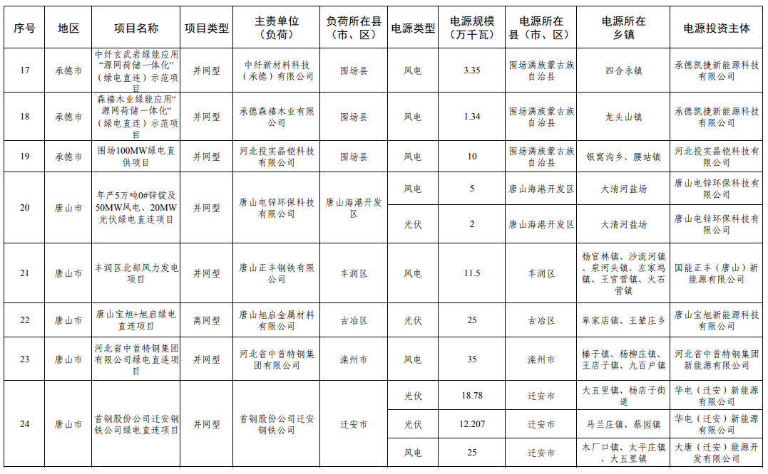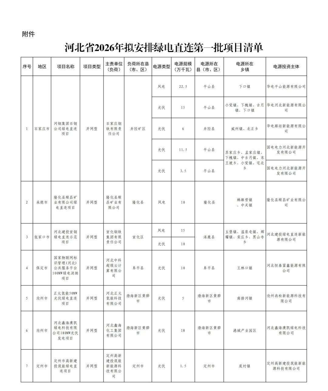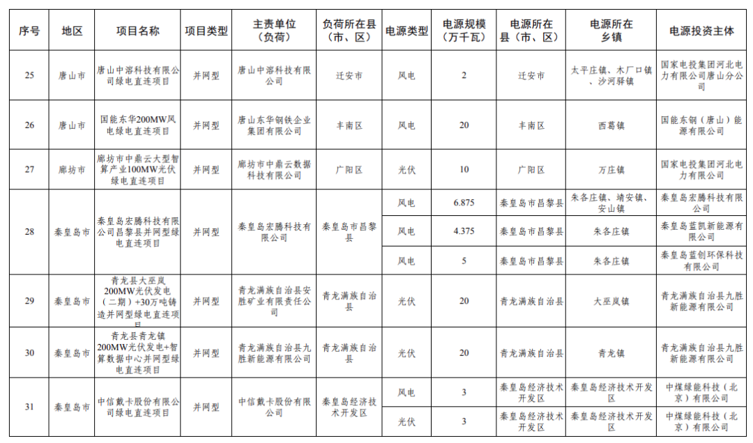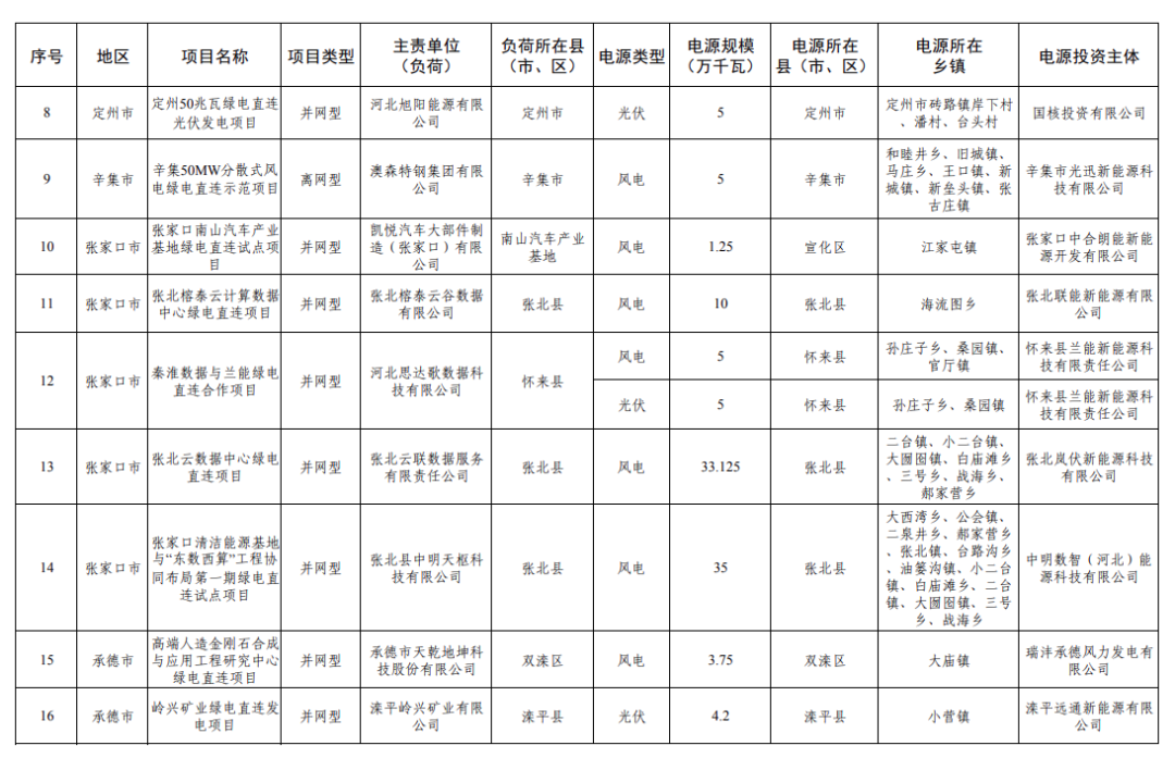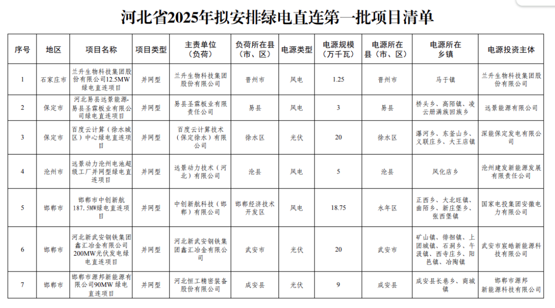 3、河北 2025年12月17日,河北省發(fā)布2025年綠電直連擬安排第一批項目情況公示,共31個、427.752萬千瓦。 2026年2月6日,河北省后發(fā)布《河北省2026年綠電直連擬安排第一批項目情況公示》、《河北省2026年綠電直連擬安排第一批項目情況補充公示》。本次項目共8個,規(guī)模共計1.436GW,其中,光伏811.44MW,風電625MW。