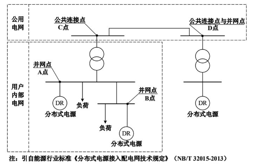附件2 并網(wǎng)點(diǎn)說明 對于有升壓站的分布式電源,并網(wǎng)點(diǎn)指升壓站高壓側(cè)母線或節(jié)點(diǎn)。對于無升壓站的分布式電源,并網(wǎng)點(diǎn)指分布式電源的輸出匯總點(diǎn)。 并網(wǎng)點(diǎn)的圖例說明如下圖所示,該用戶電網(wǎng)通過公共連接點(diǎn)C與公用電網(wǎng)相連。在用戶電網(wǎng)內(nèi)部有兩個(gè)分布式電源,分別通過A點(diǎn)和B點(diǎn)與用戶電網(wǎng)相連,A點(diǎn)和B點(diǎn)均為并網(wǎng)點(diǎn),但不是公共連接點(diǎn)。在D點(diǎn),有分布式電源直接與公共電網(wǎng)相連,D點(diǎn)是并網(wǎng)點(diǎn),也是公共連接點(diǎn)。