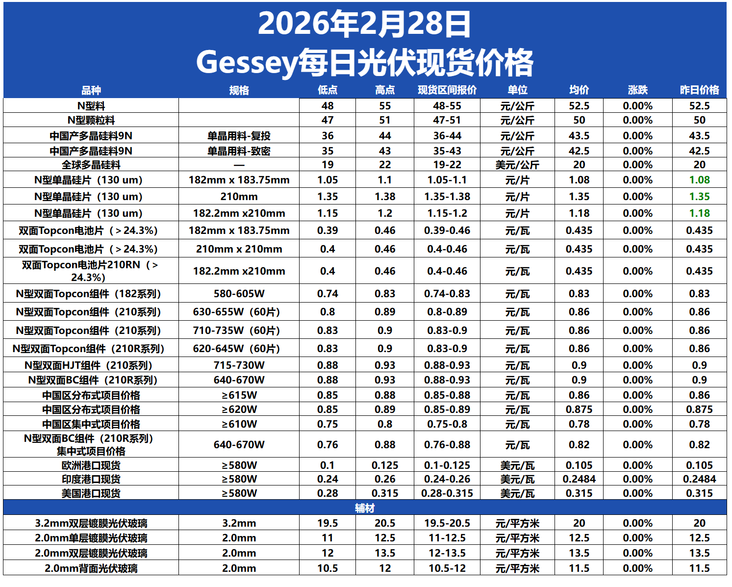今日組件價格整體維穩(wěn),N型雙面Topcon 組件(182系列)價格在0.74-0.83元/ 瓦,均價為0.83元/瓦。N型雙面Topcon 組件(210系列)價格在0.8-0.89元/ 瓦,均價為0.86元/瓦。N型雙面Topcon組件(210系列)(700-725W(60片)價格在0.83-0.9元/ 瓦,均價為0.86元/瓦。N型雙面Topcon組件(210R系列)(610-635W(60片))價格在0.83-0.9元/ 瓦,均價為0.86元/瓦。N型雙面HJT組件(210系列)價格在0.88-0.93元/ 瓦,均價為0.9元/瓦。N型雙面BC組件(210R系列)價格在0.88-0.93元/ 瓦,均價為0.9元/瓦。中國區(qū)分布式項目(≥595W)價格在0.85-0.88元/瓦,均價為0.86元/瓦,中國區(qū)分布式項目(≥615W)價格在0.85-0.89元/瓦,均價為0.875元/瓦,中國區(qū)集中式項目(≥585W)價格在0.75-0.8元/ 瓦,均價為0.78元/瓦。N型雙面BC組件(210R系列)集中式項目價格在0.76-0.88元/ 瓦,均價為0.82元/瓦。歐洲港口現(xiàn)貨價格在0.1-0.125美元/ 瓦,均價為0.105美元/瓦。印度港口現(xiàn)貨價格在0.24-0.26美元/ 瓦,均價為0.2484美元/瓦。美國港口現(xiàn)貨價格在0.28-0.315美元/ 瓦,均價為0.315美元/瓦。