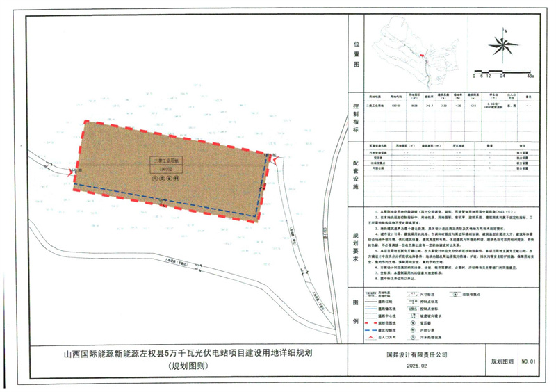 3月2日,山西省左權(quán)縣人民政府公布山西國際能源新能源左權(quán)縣5萬千瓦光伏電站項(xiàng)目建設(shè)用地詳細(xì)規(guī)劃公示。公示文件顯示,項(xiàng)目建設(shè)地址位于左權(quán)縣石匣鄉(xiāng)馬家莊村(高家窯村),規(guī)劃總用地面積9538平方米。 規(guī)劃控制指標(biāo)如下: 1、用地性質(zhì):二類工業(yè)用地(100102); 2、容積率:≥0.2; 3、建筑系數(shù):≥30%; 4、綠地率:<20%; 5、建筑高度:≤15米(工藝所需特殊構(gòu)筑物不受此限高要求)。