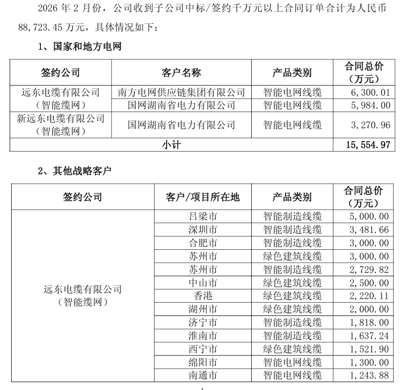 3月2日,遠(yuǎn)東股份披露子公司中標(biāo)項(xiàng)目的提示性公告,2026年2月份,其子公司中標(biāo)/簽約千萬(wàn)元以上合同訂單合計(jì)為人民幣88723.45萬(wàn)元,其中,儲(chǔ)能系統(tǒng)合同訂單總價(jià)合計(jì)為3.08億元,鋰電池合同訂單總價(jià)為0.17億元,鋰電銅箔合同訂單總價(jià)合計(jì)為0.44億元。 遠(yuǎn)東股份提到,公司堅(jiān)定落實(shí)“電能+算力+AI”戰(zhàn)略,將持續(xù)全力拓展相關(guān)核心技術(shù)產(chǎn)品/服務(wù),加大特種線(xiàn)纜、海纜、機(jī)器人線(xiàn)束、高容/固態(tài)電池/儲(chǔ)能、AI全光互聯(lián)產(chǎn)品、液冷產(chǎn)品、迭代算力芯片相關(guān)的檢測(cè)設(shè)備等具有自主知識(shí)產(chǎn)權(quán)的高附加值產(chǎn)品在國(guó)際、國(guó)內(nèi)的銷(xiāo)量,構(gòu)筑發(fā)展新優(yōu)勢(shì)。上述合同訂單將對(duì)公司未來(lái)經(jīng)營(yíng)業(yè)績(jī)產(chǎn)生積極影響,但不影響公司業(yè)務(wù)獨(dú)立性。