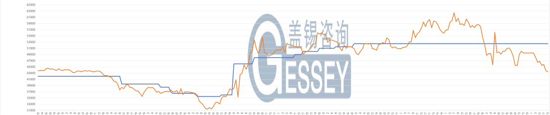 行情走勢(shì):主力合約收盤價(jià)為43500元 / 噸,前結(jié)算價(jià)為44665元/噸,收盤價(jià)較前結(jié)算價(jià)跌幅為2.61% ,收盤價(jià)較開盤價(jià)跌1165元/噸,跌幅為2.61%,成交量為140手,持倉(cāng)量為2514手。
