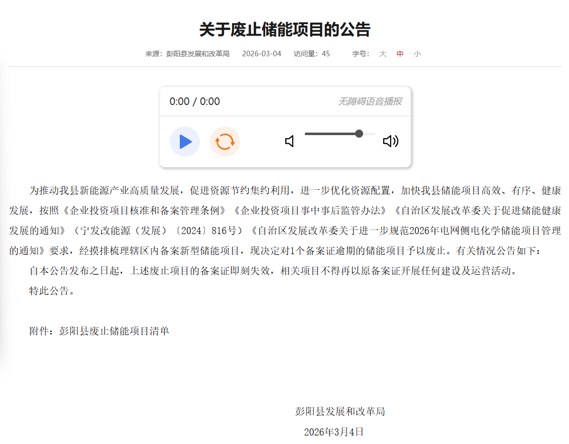 總投資4億!華電寧夏彭陽百兆瓦級共享儲能項(xiàng)目因“備案證逾期”宣告廢止2026-03-05 11:06瀏覽數(shù):165次