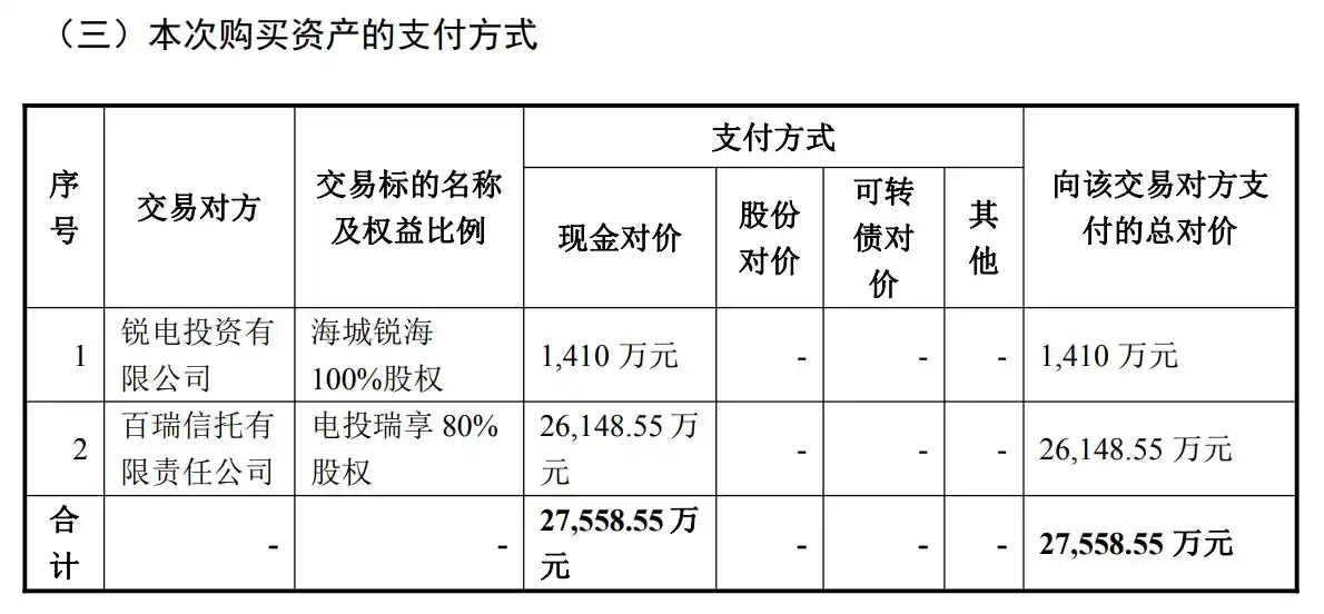 3月4日,東方新能披露重大資產(chǎn)購買報(bào)告書(草案),公司計(jì)劃通過現(xiàn)金支付方式收購海城銳海新能風(fēng)力發(fā)電有限公司(簡(jiǎn)稱“海城銳?!保?00%股權(quán)和北京電投瑞享新能源發(fā)展有限公司(簡(jiǎn)稱“電投瑞享”)80%股權(quán),交易總價(jià)格(不含募集配套資金金額)為2.76億元。