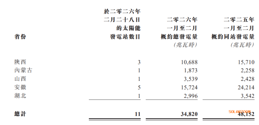 3月6日,江山控股(00295)發(fā)布公告,2026年1月至2月期間,公司擁有的太陽(yáng)能發(fā)電站總發(fā)電量約為3.48萬(wàn)兆瓦時(shí),較去年同期的4.82萬(wàn)兆瓦時(shí)下降了27.8%。截至2026年2月28日,公司總裝機(jī)量為290兆瓦。 各省份的發(fā)電量情況如下: