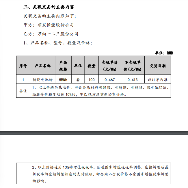 3月6日,順發(fā)恒能發(fā)布公告,披露公司擬向萬向一二三采購儲(chǔ)能產(chǎn)品,并簽署《采購框架合同》,預(yù)計(jì)關(guān)聯(lián)交易含稅金額不超過2.34億元,占公司2024年經(jīng)審計(jì)凈資產(chǎn)的4.06%。 根據(jù)公告,本次采購產(chǎn)品為5MWh儲(chǔ)能電池艙,共100套,含稅單價(jià)為0.467元/Wh。合同約定,該價(jià)格為基準(zhǔn)價(jià),當(dāng)設(shè)備原材料碳酸鋰、電解銅、電解液等價(jià)格變動(dòng)達(dá)10%時(shí),雙方應(yīng)重新協(xié)商價(jià)格。合同有效期至2026年12月31日,具體以訂單形式執(zhí)行。