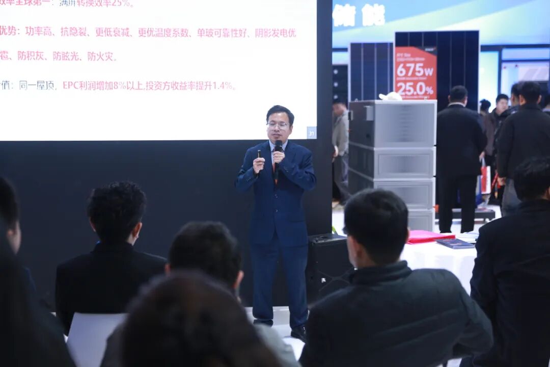 愛旭股份分布式業(yè)務魯皖區(qū)產(chǎn)品解決方案總監(jiān)王曉乾則發(fā)表《愛旭ABC組件滿格實力,驅(qū)動價值躍升》主題演講。他表示,通過滿屏升級與尺寸優(yōu)化,愛旭ABC組件實現(xiàn)了“更高功率、更多發(fā)電、更佳場景適應、更高安全性”的全面領先。相同安裝面積下,功率較TOPCon組件高出8%以上;–0.26%/℃更優(yōu)溫度系數(shù)與≤0.35%的逐年衰減,確保長期發(fā)電穩(wěn)定性;單片電池被完全遮擋時,發(fā)電性能較TOPCon提升30%以上。安全方面,ABC組件斬獲全球首張TüV萊茵抗起火風險認證,疊加單面焊接技術帶來的抗隱裂性能,滿足各類嚴苛場景的安全需求。他用一組組扎實數(shù)據(jù)證明,相同面積下使用72滿屏ABC組件可使EPC利潤提升8%、投資商IRR提升1.4%,而78大版型ABC組件在典型戶用屋頂中更可助力投資商IRR提升4.1%,讓ABC的高價值從技術參數(shù)轉(zhuǎn)化為可感知的投資回報,引發(fā)觀眾強烈共鳴。 收官亦是新起點 ABC持續(xù)領航光儲融合 三天展期,愛旭ABC組件以硬核技術實力贏得了行業(yè)的口碑與市場的關注。從初日的驚艷亮相,到展期的持續(xù)引爆,再到圓滿收官,愛旭用一場高質(zhì)量的亮相,向業(yè)界證明了高效光伏技術在光儲融合新時代的核心價值。 展會雖已落幕,創(chuàng)新永不止步。面向未來,愛旭將繼續(xù)深耕ABC技術,以更高效率、更優(yōu)性能、更安全可靠的產(chǎn)品,攜手全球合作伙伴,共同探索光儲融合的無限可能,為構建清潔低碳、安全高效的新型能源體系注入源源不斷的創(chuàng)新動力。