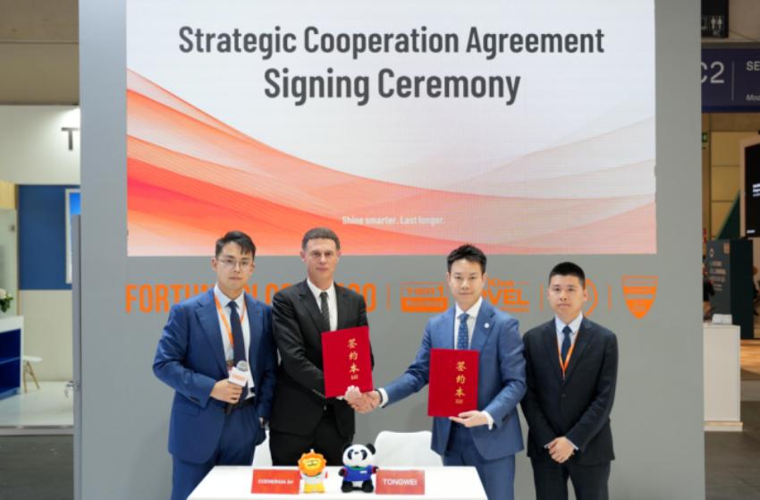 【合作速遞】2026 年 3 月 11 日,在 KEY -The Energy Transition Expo 2026 展會期間,通威股份與意大利市場占有率第一的光伏分銷商 Coenergia 達(dá)成二次合作,正式簽署 200MW 高效光伏組件合作協(xié)議。此次合作將依托通威 TNC 3.0 組件的技術(shù)優(yōu)勢,適配意大利市場需求,加速高效組件在南歐地區(qū)的規(guī)?;瘧?yīng)用。 在歐洲能源轉(zhuǎn)型持續(xù)提速的背景下,意大利光伏市場正迎來新的增長周期。KEY -The Energy Transition Expo 2026 展會期間,通威與意大利領(lǐng)先光伏分銷商 Coenergia再度達(dá)成合作,雙方正式簽署200MW 高效光伏組件合作協(xié)議。 通威股份光伏商務(wù)部組件營銷海外負(fù)責(zé)人陳方舟與 Coenergia 首席執(zhí)行官 Carlo Moretti 代表雙方簽約。此次合作將進(jìn)一步鞏固雙方在意大利市場的合作基礎(chǔ),并加速高效光伏組件在南歐地區(qū)的應(yīng)用落地。
