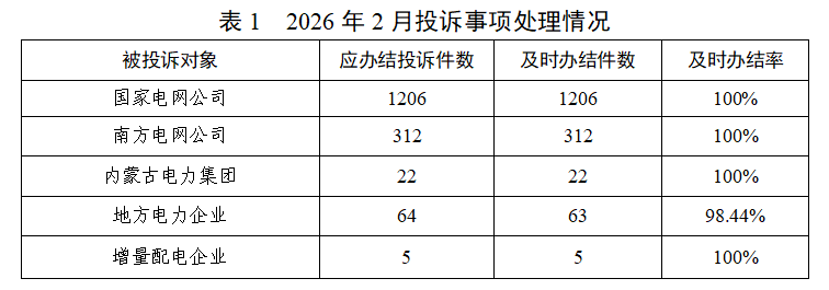 圖1 主要投訴分類占比情況 (二)投訴處理情況 能源企業(yè)應(yīng)在2026年2月份辦結(jié)投訴1609件(含上月結(jié)轉(zhuǎn)),及時(shí)辦結(jié)1608件,及時(shí)辦結(jié)率99.94%(詳見表1)。