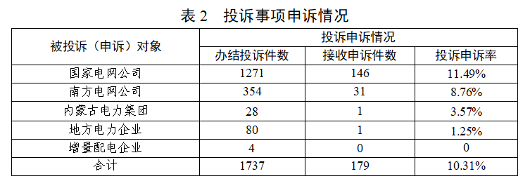 (三)投訴熱點(diǎn)問題 一是部分供電企業(yè)停電搶修、復(fù)電不及時(shí)。云南臨滄、內(nèi)蒙古呼倫貝爾等地供電企業(yè)因搶修工程量大、協(xié)調(diào)力度不夠等原因,導(dǎo)致用戶停電時(shí)間過長。黑龍江大慶等地供電企業(yè)在用戶繳納電費(fèi)遠(yuǎn)程復(fù)電失敗后,未及時(shí)進(jìn)行人工復(fù)電。 二是部分供電企業(yè)用電報(bào)裝辦理不規(guī)范。云南紅河州等地供電企業(yè)對用電報(bào)裝所需資料未能一次性告知到位,導(dǎo)致用戶重復(fù)往返提交資料;廣東湛江、陜西榆林等地供電企業(yè)因工作協(xié)調(diào)不到位、材料設(shè)備調(diào)配不及時(shí)等原因,辦理用電報(bào)裝超時(shí)。 三是部分地區(qū)出現(xiàn)多次停電、低電壓等現(xiàn)象。貴州貴陽、四川甘孜州等地供電企業(yè)因線路設(shè)備改造不及時(shí)、運(yùn)維巡檢不到位等,造成部分臺(tái)區(qū)出現(xiàn)多次停電;廣西賀州、湖南湘潭等地因設(shè)備故障、用電負(fù)荷突增、線徑偏小等原因,造成部分用戶電壓不穩(wěn)或低電壓。 二、申訴情況 (一)申訴接收情況 2026年2月,辦結(jié)投訴事項(xiàng)1737件(含上月結(jié)轉(zhuǎn)),熱線平臺(tái)接收申訴事項(xiàng)179件,投訴申訴率10.31%。從申訴內(nèi)容看,主要集中在用電報(bào)裝、電表計(jì)量、線路安全等方面(詳見圖2)。其中,涉及國家電網(wǎng)公司146件、南方電網(wǎng)公司31件、內(nèi)蒙古電力集團(tuán)1件、地方電力企業(yè)1件(詳見表2)。