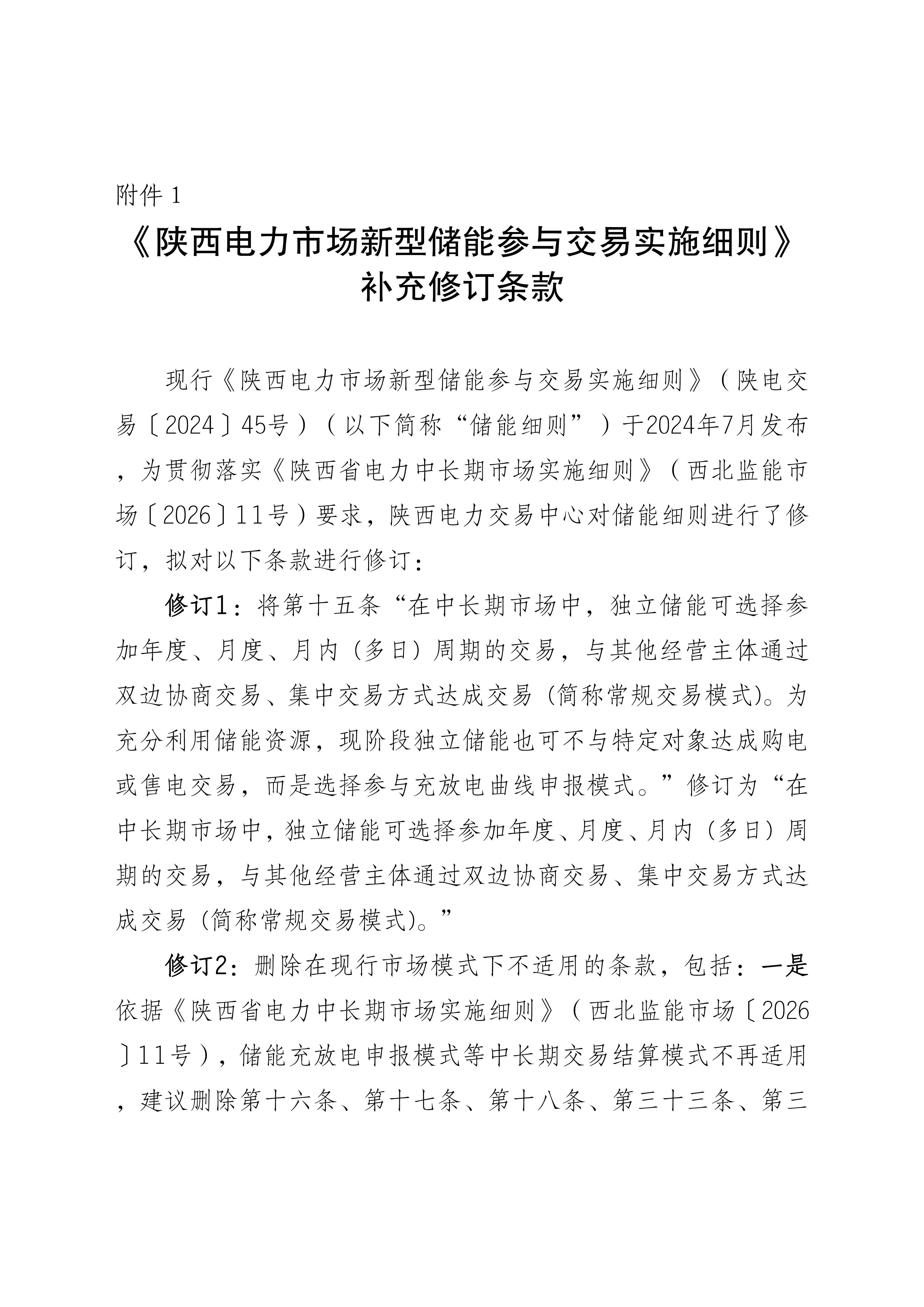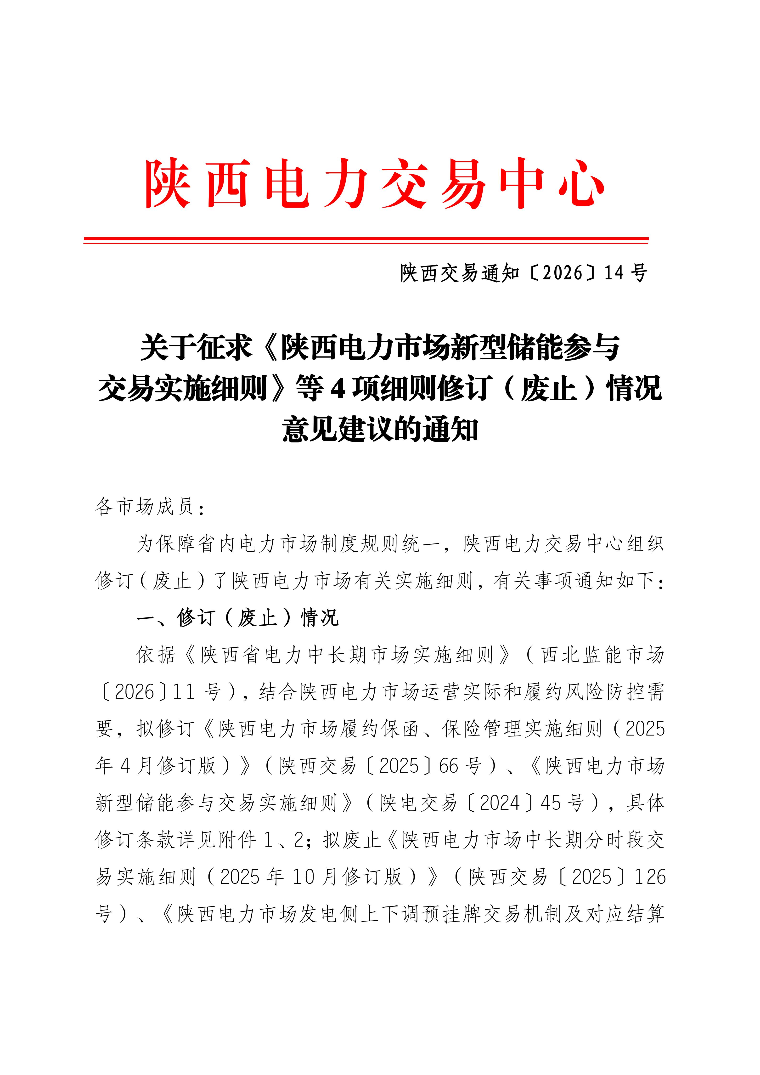 【政策重點提煉】3月18日陜西電力交易中心發(fā)布征求意見通知,擬修訂《新型儲能參與交易實施細則》《履約保函保險管理細則》,擬廢止《中長期分時段交易實施細則》《發(fā)電側上下調預掛牌交易細則》;新規(guī)則以《陜西省電力中長期市場實施細則(2026)》為核心,儲能交易將刪除充放電申報等舊模式,全面適配現貨與中長期市場新體系。 詳情如下: